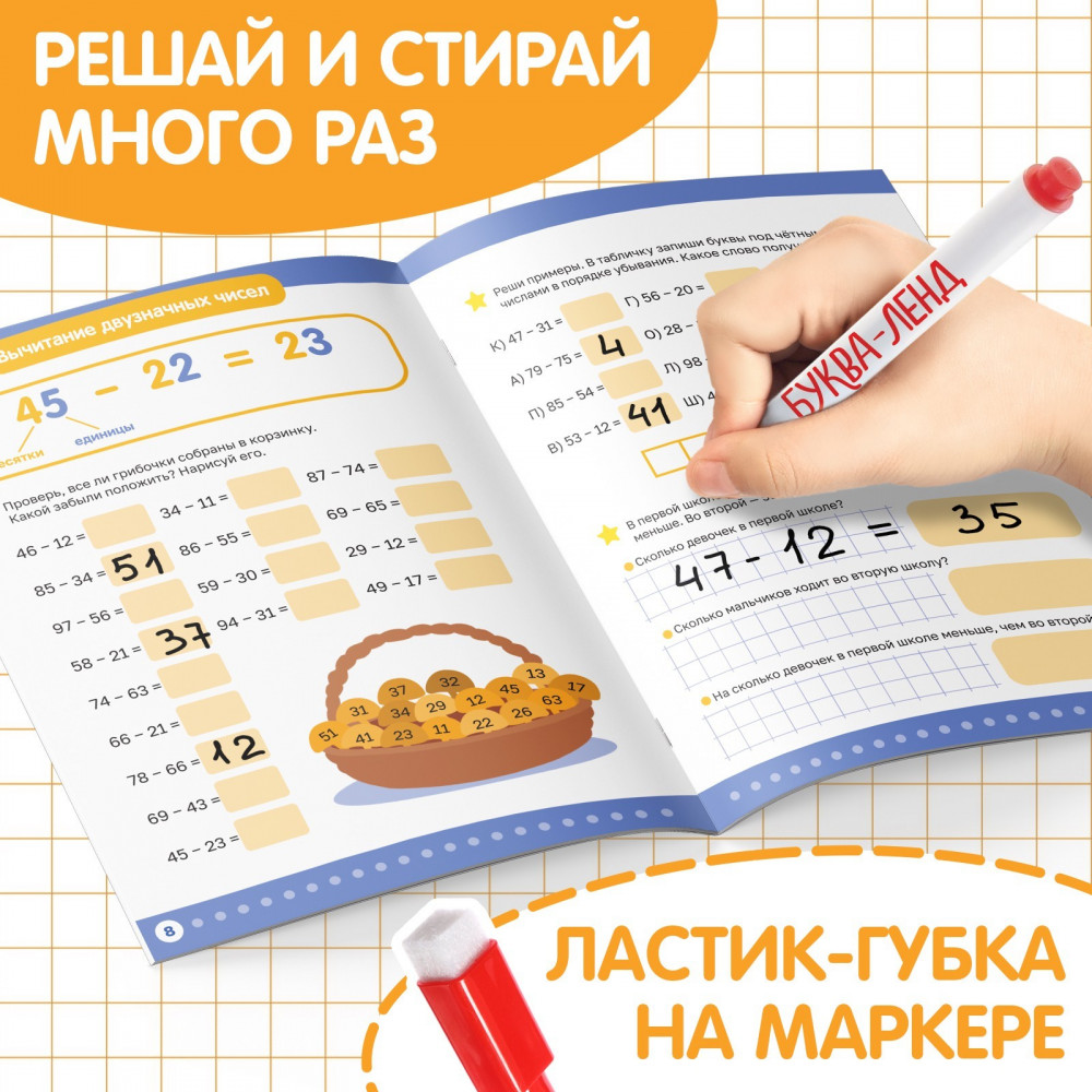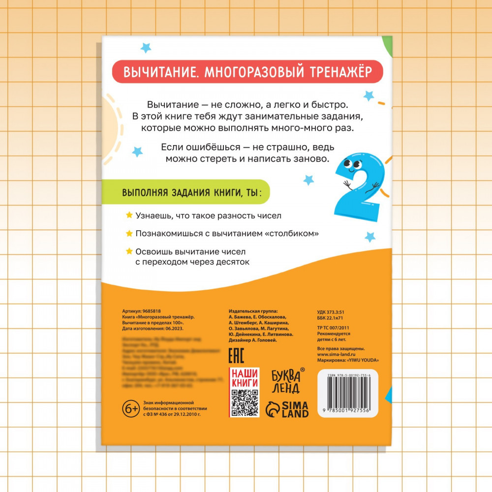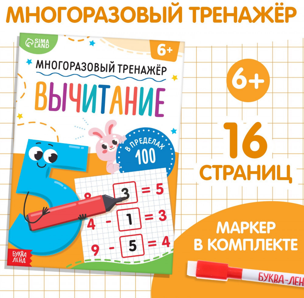 💳 Оплатить за товар можно при получении 🇰🇿 Есть бесплатная доставка по Казахстану от 1 дня 🎁 Копите бонусы с каждой покупки Серия: Книжки многоразовые Многоразовый тренажёр — удобный инструмент для дошкольной подготовки деток. С данной книгой ребёнок обучится арифметике, а именно изучит вычитание. |