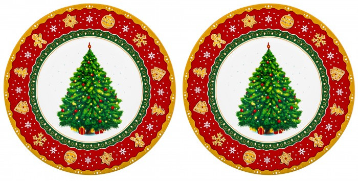 Столовый набор состоит из 2 тарелок выполненых из фарфора нового поколения new bone china и подойдёт для любой еды и сладостей. Этот материал не уступает другим видам фарфора по качеству, но при этом гораздо более экологичный в производстве. Дизайнерская коллекция посуды от бренда Elan Gallery украшена изображением пушистой ёлочки и узором из имбирных пряников и снежинок. Декоративная посуда создаст в вашем доме атмосферу волшебства и подарит праздничное настроение. Праздничные десертные тарелочки станут украшением вашей кухни, можно использовать как пирожковые. Набор обеденных тарелок отлично подойдёт для любых закусок, например, фруктов или нарезки.