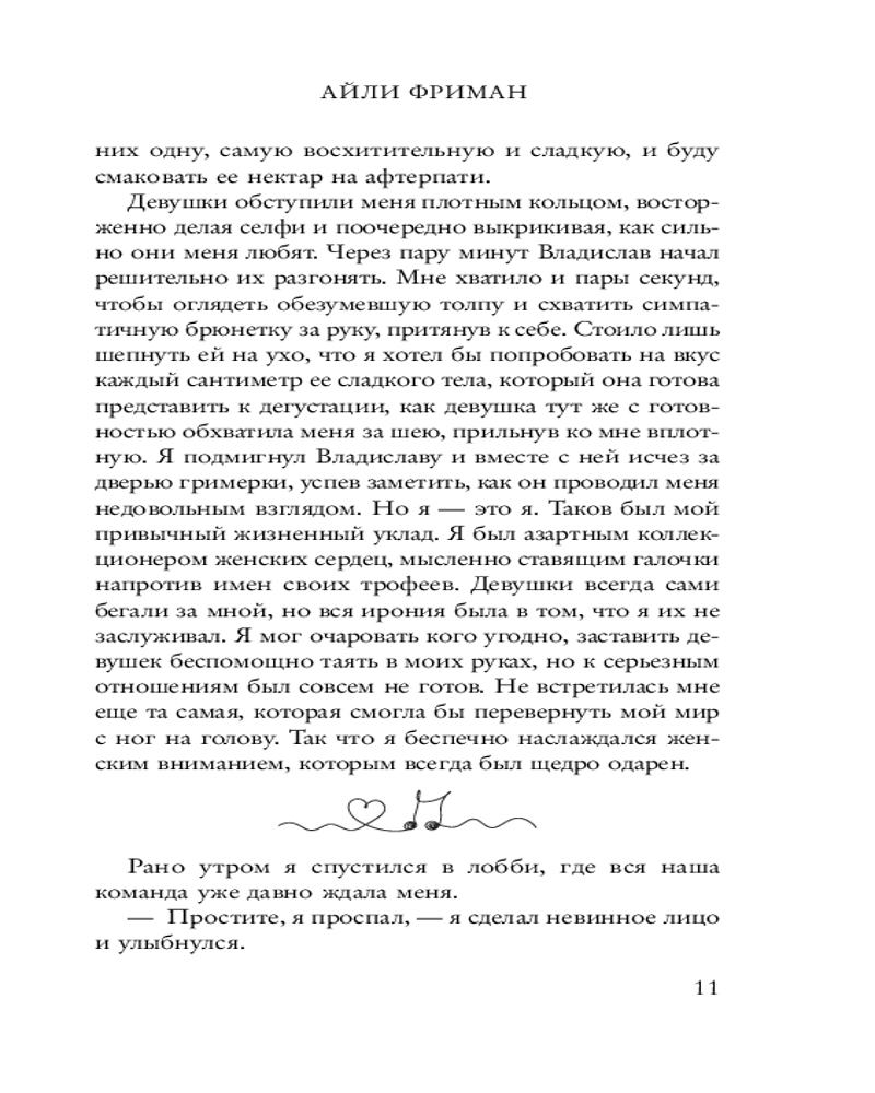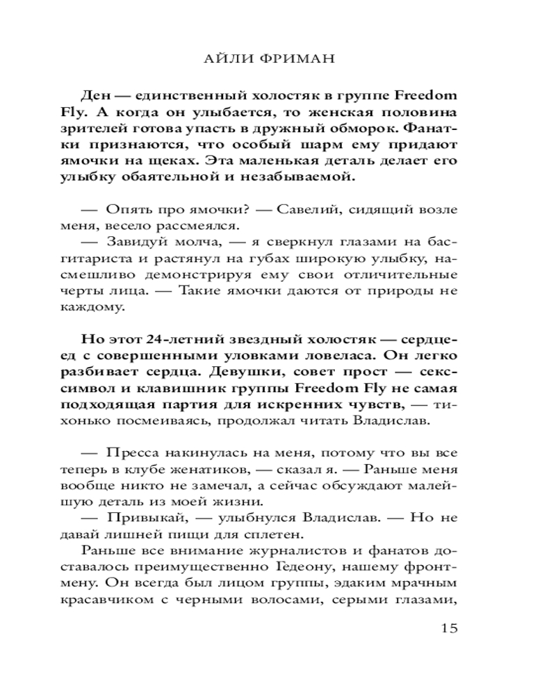 И вновь Айли пишет ярко, неистово, раскрывая драму героев и жизнь рок-музыкантов. Он — популярный клавишник, она — приемная дочь богатого человека, чья репутация под угрозой. Три обещанных поцелуя, пресса, преследования папарацци, семейная драма, запретная страсть и любовь двух израненных сердец. Внутри романа вы найдете тексты песен, сочиненных автором и вплетенных в сюжет. Айли Фриман вложила столько огня в свой роман, что это буквально сочится сквозь строки! |