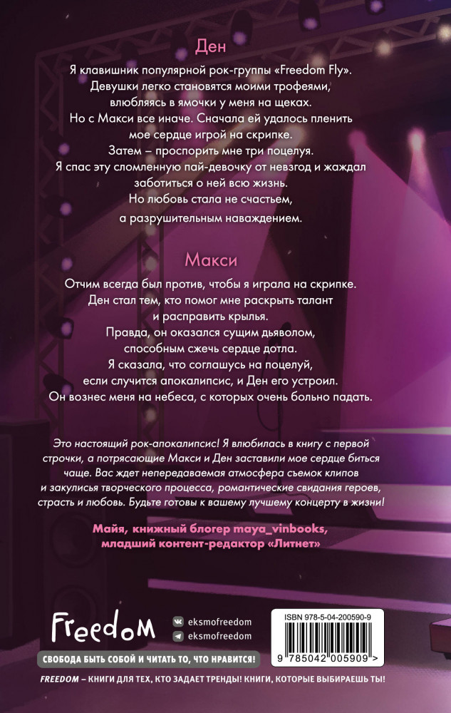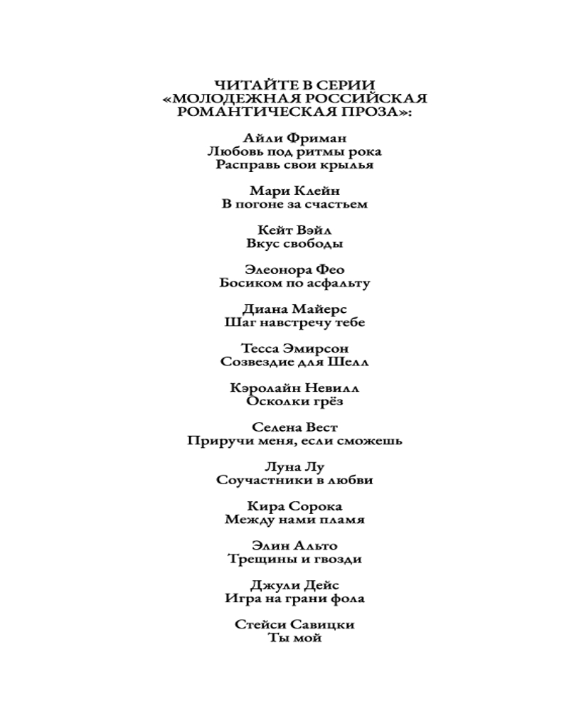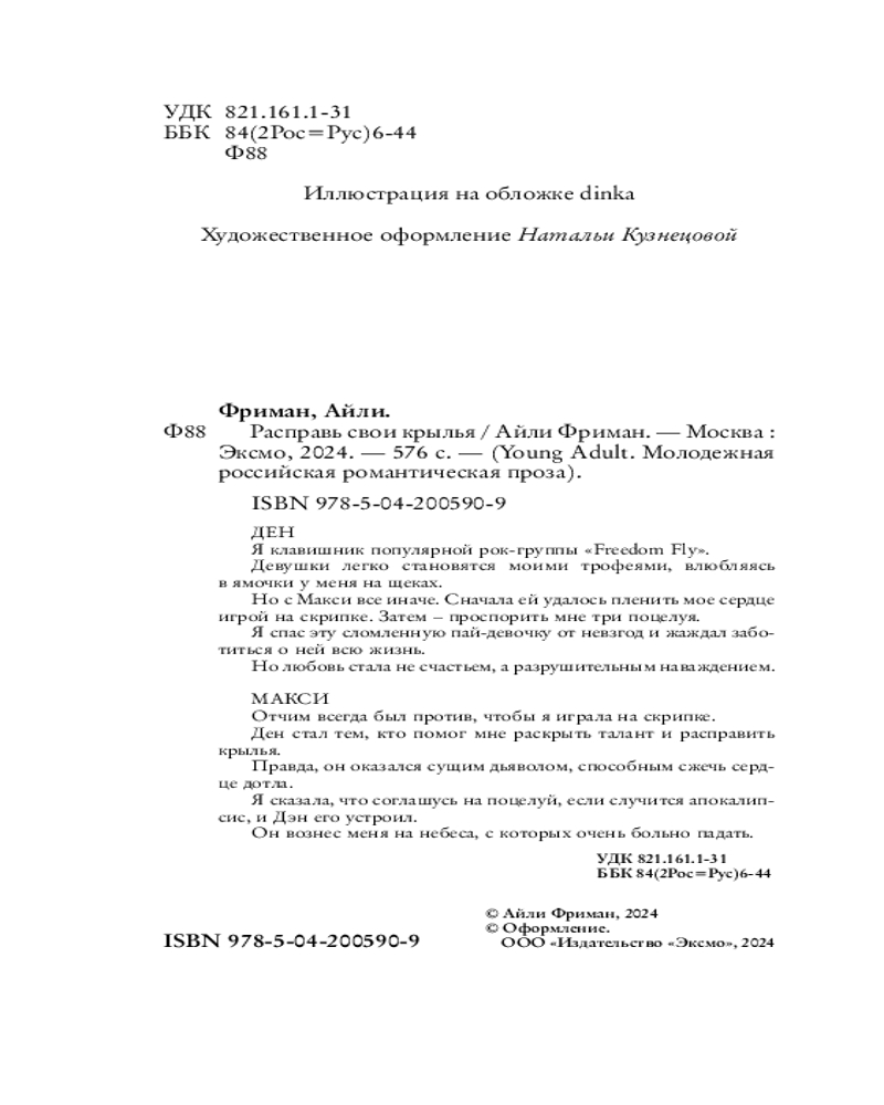 Серия: Young Adult. Молодежная российская романтическая проза Страстная новинка от Айли Фриман — писательницы, которая знает о рок-музыке все! Ее роман «Любовь под ритмы рока» о музыкантах группы «Freedom Fly» покорил сердца тысяч читателей. «Расправь свои крылья» — спин-офф истории, о клавишнике группы Дэне и его искренней любви к девушке Макси. Драйв, адреналин, драма и стекло — в романе все, что вы так любите. Для всех поклонников творчества Эммы Скотт, любовных романов Тилли Коул и Бриттани Ш. Черри.