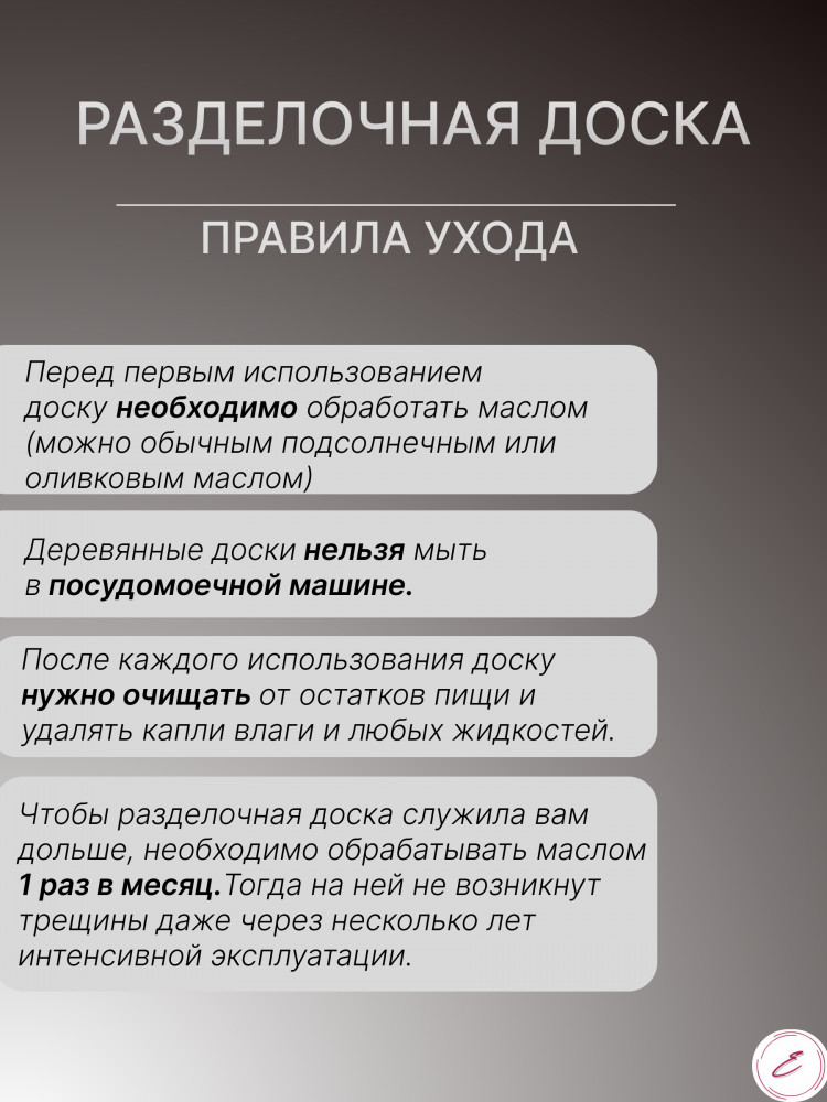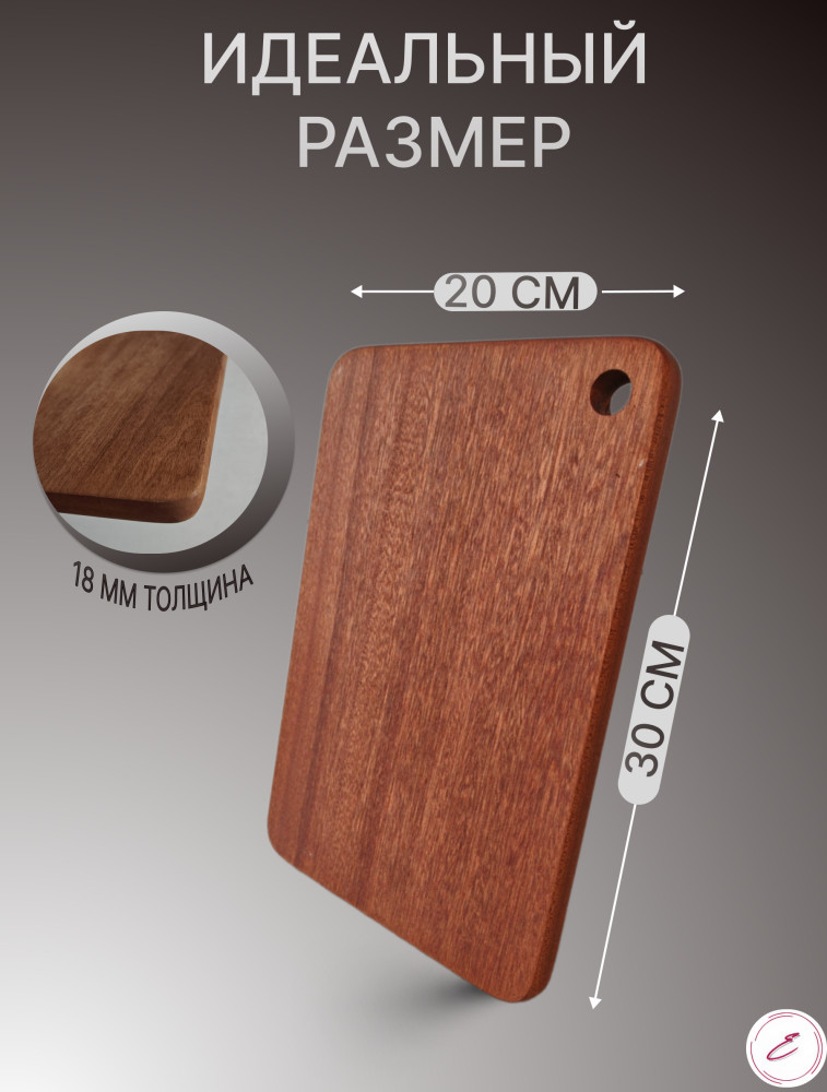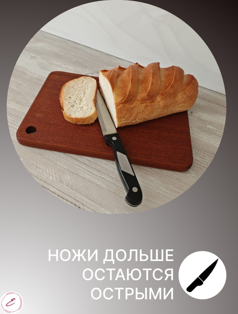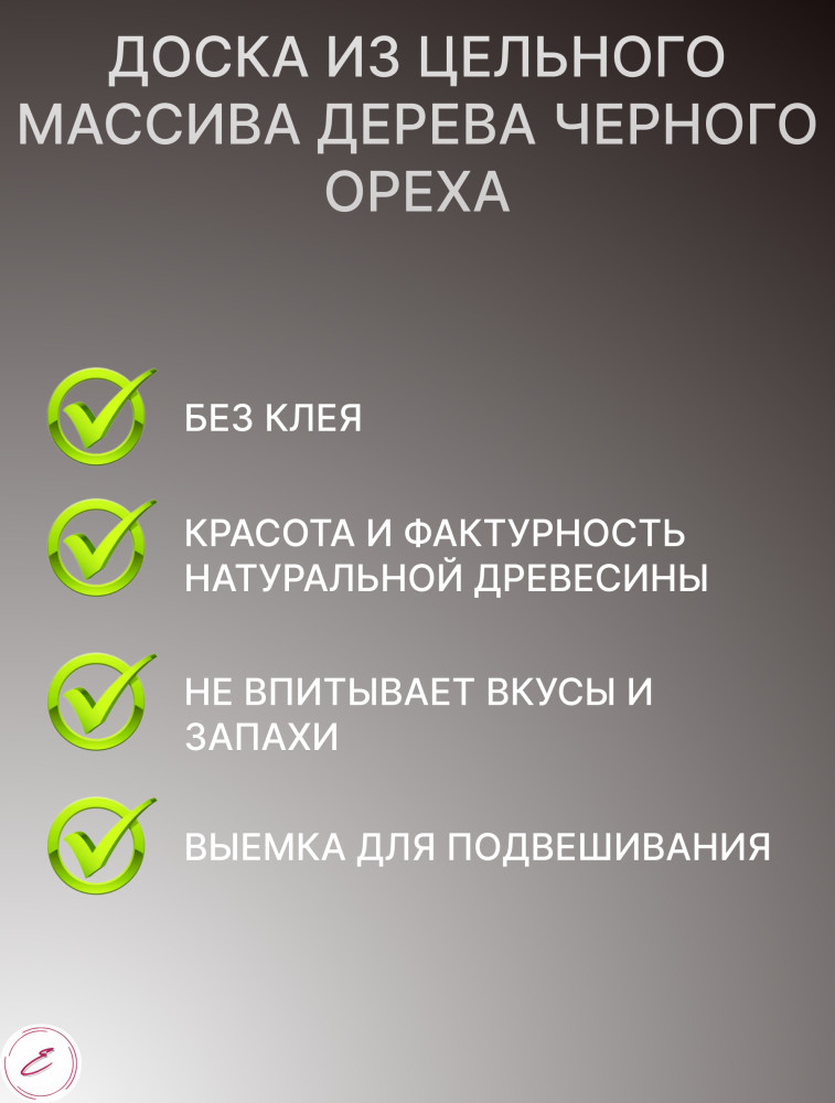 Важное правило при уходе за деревянной утварью — исключать долговременный контакт ее с водой. Не отправлять доску в посудомоечную машину, оставлять в раковине с грязной посудой или подвергать замачиванию. Чтобы доска прослужила вам дольше — её нужно периодически обрабатывать подсолнечным или оливковым маслом. Такая толстая и твердая дощечка будет служить верой и правдой при приготовлении ежедневных блюд для всей семьи. Выведите вашу кухню на новый уровень комфорта с этой стильной доской из массива дерева черного ореха. Подарите эту красивую досочку своей супруге, маме или сестре в день рождения или на праздник.