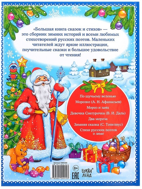 В данный момент этот товар отсутствует в продаже. Возможно, у нас найдется аналогичный или похожий товар здесь. Серия: Новогодние книги Буква-Ленд «Большая книга сказок и стихов» подарит малышу новогоднее настроение. В сборник входят стихи о зиме А. Пушкина, Ф. Тютчева, С. Есенина и А. Фета, сказки В. Даля и А. Афанасьева.