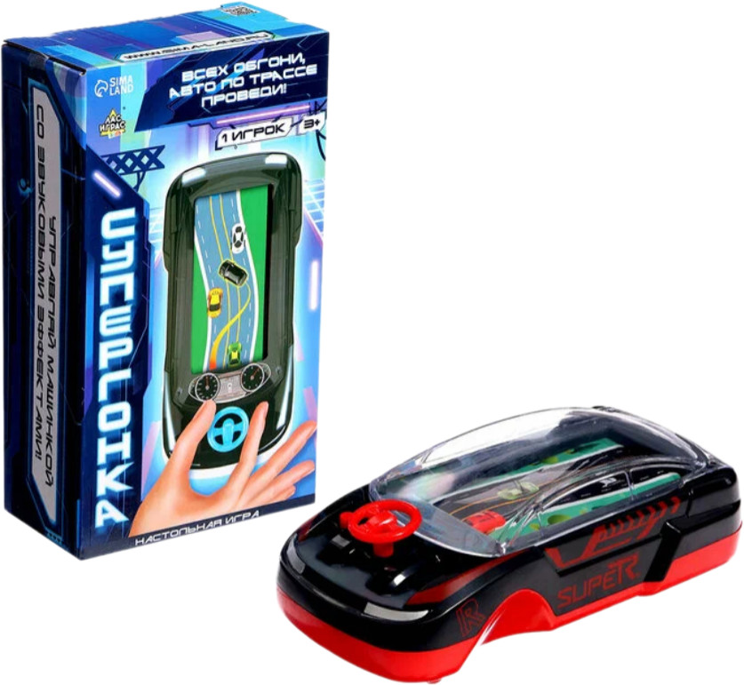 Супергонка — настольная игра для детей от 3 лет. Малыша ждёт захватывающая гонка c препятствиями. Ребёнок почувствует себя автомобильным спортсменом, которому предстоит преодолеть дорожные опасности и остаться на трассе.