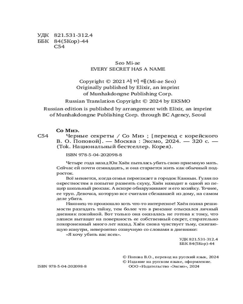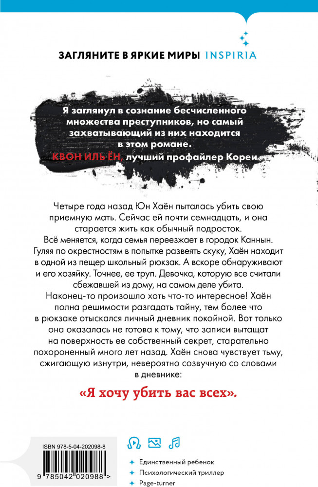 💳 Оплатить за товар можно при получении 🇰🇿 Есть бесплатная доставка по Казахстану от 1 дня 🎁 Копите бонусы с каждой покупки Серия: Tok. Национальный бестселлер. Корея Четыре года назад Юн Хаён пыталась убить свою приемную мать. Сейчас ей почти семнадцать, и она старается жить как обычный подросток. Всё меняется, когда семья переезжает в городок Каннын. Гуляя по окрестностям в попытке развеять скуку, Хаён находит в одной из пещер школьный рюкзак. А вскоре обнаруживают и его хозяйку. Точнее, ее труп. Девочка, которую все считали сбежавшей из дому, на самом деле убита. |