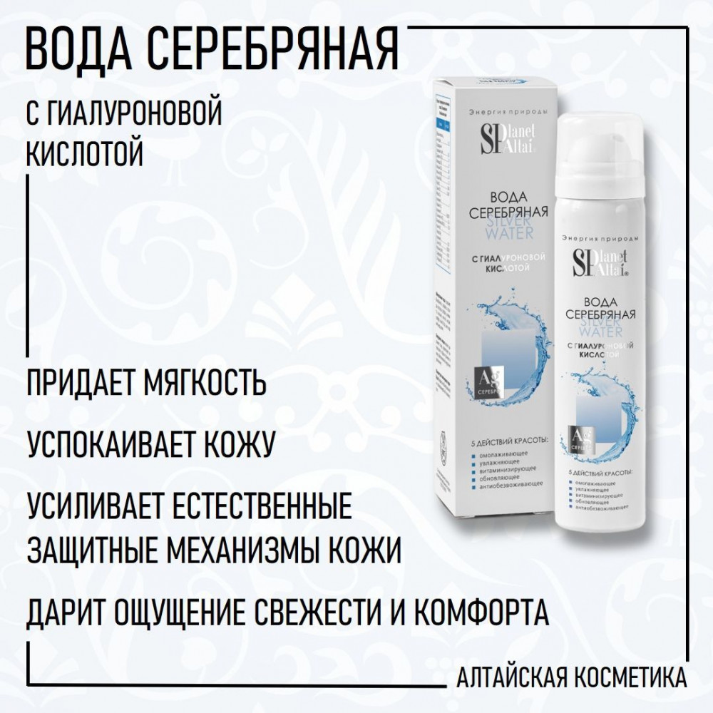 Минеральная вода, ставшая основой для продукта, содержит необходимые для кожи микроэлементы: бикарбонаты, сульфаты, хлориды, фториды, фосфаты, силикаты, кальций, магний, натрий, серебро, калий, бор, цинк, кадмий, медь, селен. Кожа мгновенно преображается, наполняясь влагой и тонусом. Формула усилена коллоидным серебром, которое обладает антибактериальной и противомикробной активностью. Доказано, что оно способно уничтожать более 650 видов бактерий и вирусов, поэтому серебро используется человеком для борьбы с различными микроорганизмами на протяжении тысячелетий. Благодаря волшебным свойствам серебра, при регулярном использовании воды серебряной несовершенства станут менее заметны.