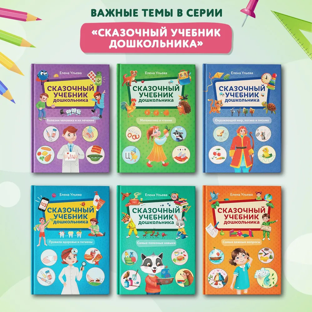 💳 Оплатить за товар можно при получении 🇰🇿 Есть бесплатная доставка по Казахстану от 1 дня 🎁 Копите бонусы с каждой покупки Серия: Сказочный учебник дошкольника Новая серия красочных, ярких, увлекательных, а самое главное — невероятно полезных и познавательных развивающих пособий от известного детского педагога Елены Ульевой. Эти книги помогут вашему малышу получить весь комплекс знаний и навыков, необходимых при поступлении в школу. С ними обучение будет проходить с удовольствием, скучная подготовка к школе превратится в захватывающую игру с участием сказочных героев. В итоге будущий первоклассник легко освоит чтение и счёт, разовьёт мышление, логику, узнает о здоровом образе жизни, получит ответы на свои самые важные вопросы и приобретёт множество полезных навыков, которые обязательно пригодятся ему в дальнейшем. |