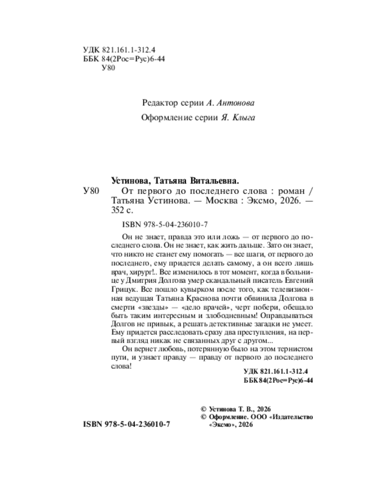 💳 Оплатить за товар можно при получении 🇰🇿 Есть бесплатная доставка по Казахстану от 1 дня 🎁 Копите бонусы с каждой покупки Серия: Столичный детектив. Новое оформление (обложка) Он не знает, правда это или ложь — от первого до последнего слова. Он не знает, как жить дальше. Зато он знает, что никто не станет ему помогать — все шаги, от первого до последнего, ему придется делать самому, а он всего лишь врач, хирург!.. Всё изменилось в тот момент, когда в больнице у Дмитрия Долгова умер скандальный писатель Евгений Грицук. Всё пошло кувырком после того, как телевизионная ведущая Татьяна Краснова почти обвинила Долгова в смерти «звезды» — «дело врачей», черт побери, обещало быть таким интересным и злободневным! Оправдываться Долгов не привык, а решать детективные загадки не умеет. Ему придется расследовать сразу два преступления, на первый взгляд никак не связанных друг с другом... Он вернет любовь, потерянную было на этом тернистом пути, и узнает правду — правду от первого до последнего слова! |