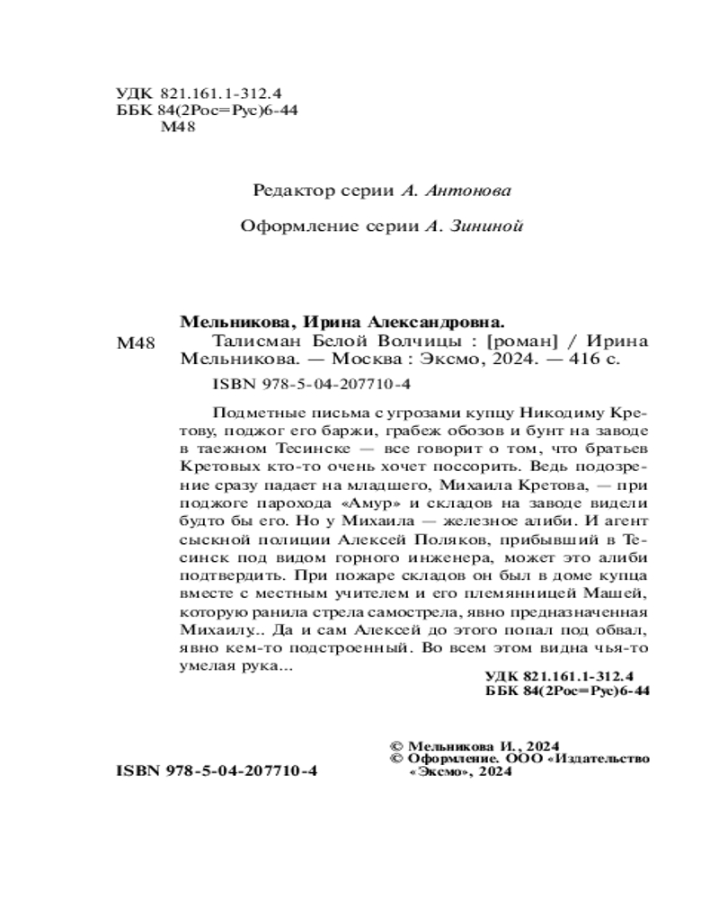 Талисман Белой ВолчицыИрина Александровна Мельникова В данный момент этот товар отсутствует в продаже. Возможно, у нас найдется аналогичный или похожий товар здесь. Серия: Любовь, интрига, тайна. Новое оформление (обложка) Подметные письма с угрозами купцу Никодиму Кретову, поджог его баржи, грабеж обозов и бунт на заводе в таежном Тесинске — все говорит о том, что братьев Кретовых кто-то очень хочет поссорить. Ведь подозрение сразу падает на младшего, Михаила Кретова, — при поджоге парохода «Амур» и складов на заводе видели будто бы его. Но у Михаила — железное алиби. И агент сыскной полиции Алексей Поляков, прибывший в Тесинск под видом горного инженера, может это алиби подтвердить. При пожаре складов он был в доме купца вместе с местным учителем и его племянницей Машей, которую ранила стрела самострела, явно предназначенная Михаилу... Да и сам Алексей до этого попал под обвал, явно кем-то подстроенный. Во всем этом видна чья-то умелая рука... |