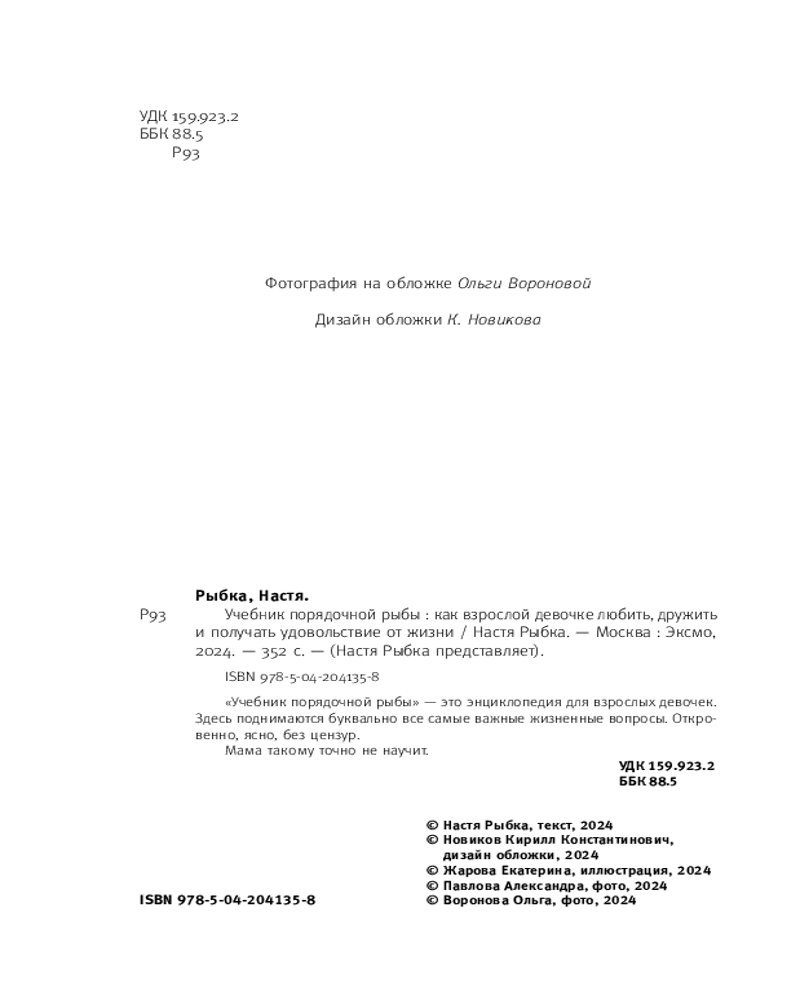 💳 Оплатить за товар можно при получении 🇰🇿 Есть бесплатная доставка по Казахстану от 1 дня 🎁 Копите бонусы с каждой покупки Серия: Настя Рыбка представляет Настя Рыбка — известный блогер, модель и колумнист журнала Play Boy, создатель курсов по соблазнению и любви к себе. Учебник порядочной рыбы — это энциклопедия для взрослых девочек. Здесь поднимаются буквально все самые важные жизненные вопросы. Откровенно, ясно, без цензур. Мама такому точно не научит. |