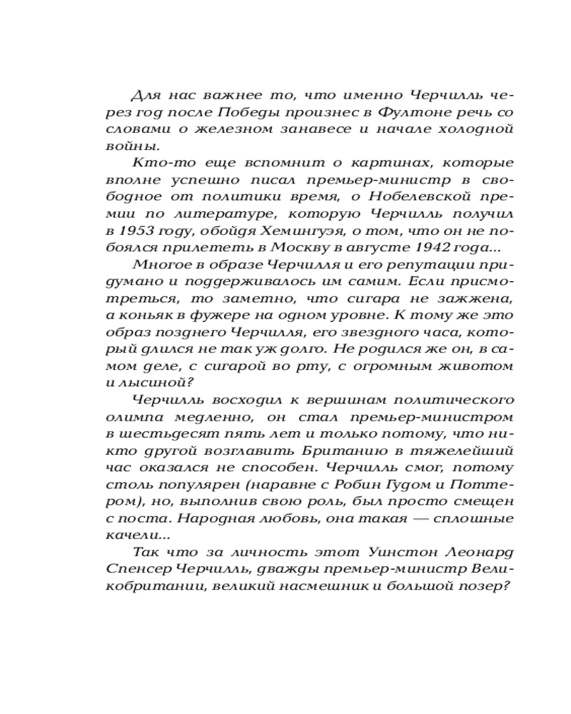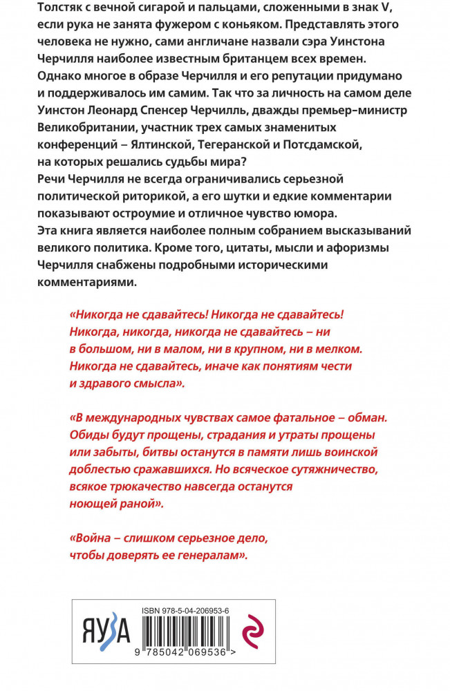💳 Оплатить за товар можно при получении 🇰🇿 Есть бесплатная доставка по Казахстану от 1 дня 🎁 Копите бонусы с каждой покупки Серия: Король говорит! Цитаты и мысли гениев Толстяк с вечной сигарой и пальцами, сложенными в знак V, если рука не занята фужером с коньяком. Представлять этого человека не нужно, сами англичане назвали сэра Уинстона Черчилля наиболее известным британцем всех времен. Однако многое в образе Черчилля и его репутации придумано и поддерживалось им самим. Так что за личность на самом деле Уинстон Леонард Спенсер Черчилль, дважды премьер-министр Великобритании, участник трех самых знаменитых конференций — Ялтинской, Тегеранской и Потсдамской, на которых решались судьбы мира? Речи Черчилля не всегда ограничивались серьезной политической риторикой, а его шутки и едкие комментарии показывают остроумие и отличное чувство юмора. Эта книга является наиболее полным собранием высказываний великого политика. Кроме того, цитаты, мысли и афоризмы Черчилля снабжены подробными историческими комментариями. |