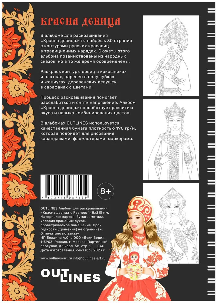 Outlines Раскраска «Красна девица»В данный момент этот товар отсутствует в продаже. Возможно, у нас найдется аналогичный или похожий товар здесь. В альбоме для раскрашивания «Красна девица» ты найдёшь 30 страниц с контурами русских красавиц в традиционных нарядах. Сюжеты этого альбома позаимствованы из народных сказок, но в то же время осовременены. Раскрась контуры девиц в кокошниках и платках, царевен в полушубках и жемчугах, деревенских девушек в сарафанах с цветами. В альбомах Outlines используется качественная бумага плотностью 190 гр/м, которая подойдёт для рисования карандашами, фломастерами, маркерами. |