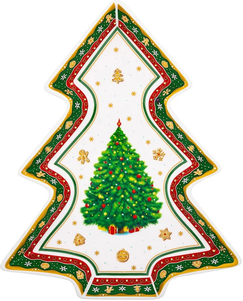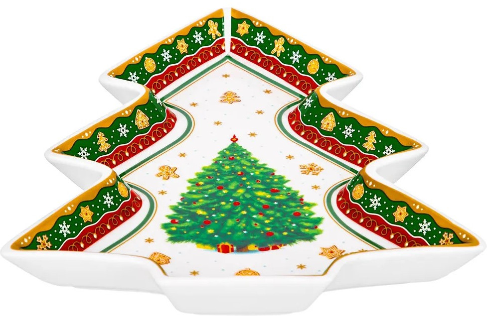Блюдо Elan Gallery выполнено из фарфора нового поколения new bone china. Благодаря современным технологиям он не уступает другим видам фарфора в прочности, но при этом экологичнее в производстве. Дизайнерская коллекция посуды от бренда Elan Gallery украшена изображением пушистой ёлочки и узором из имбирных пряников и снежинок. Она создаст в вашем доме атмосферу волшебства и подарит праздничное настроение.