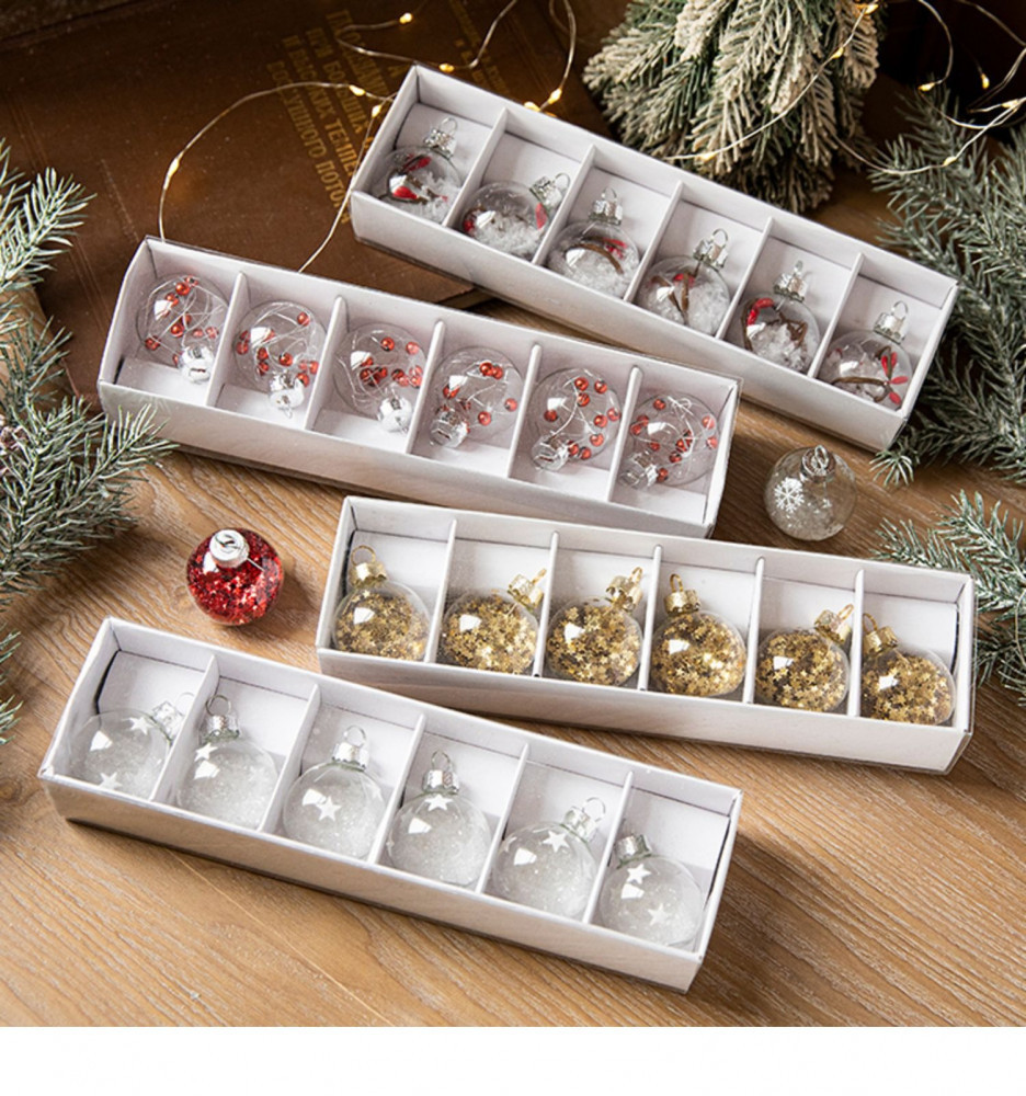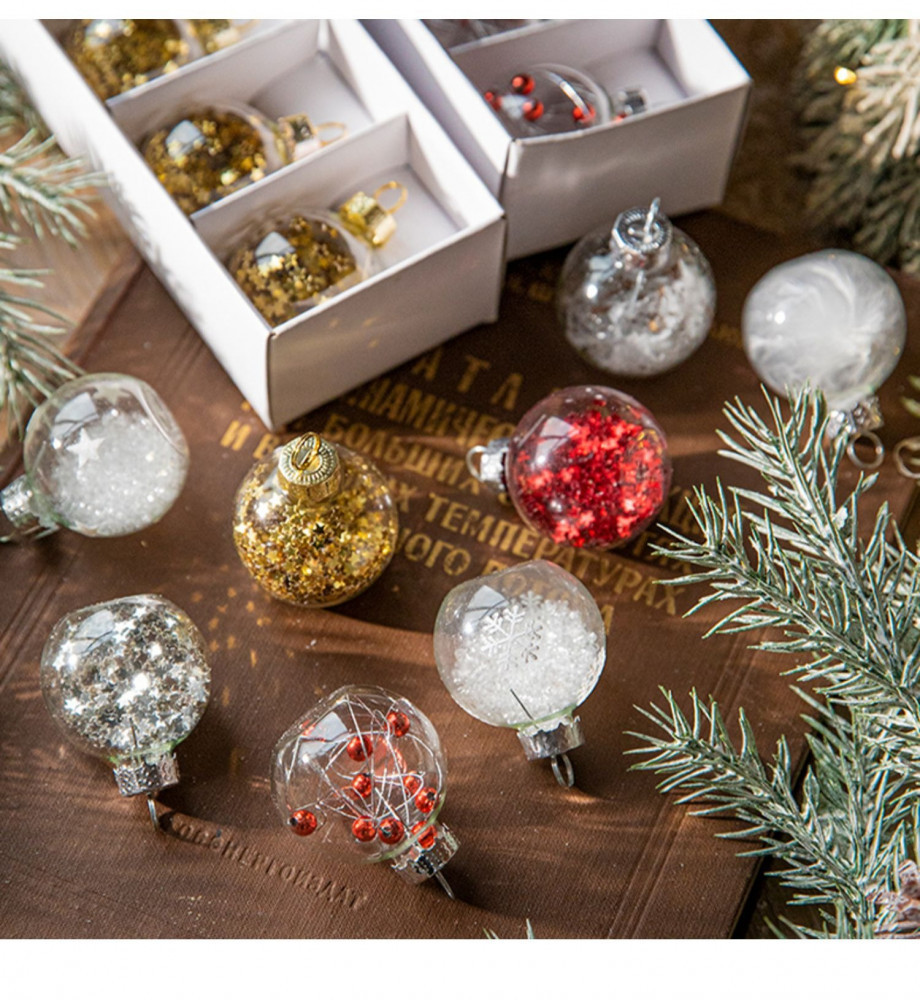 шарики заполнены кристаликами снега с вкраплениями красных ягодок на веточке,рекомендую