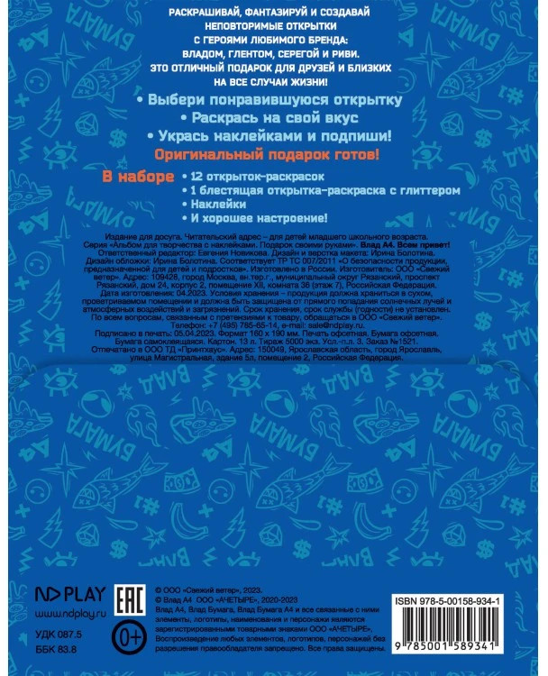💳 Оплатить за товар можно при получении 🇰🇿 Есть бесплатная доставка по Казахстану от 1 дня 🎁 Копите бонусы с каждой покупки Серия: Влад А4 Набор для творчества с наклейками «Влад А4» поможет ребенку изготовить подарок своими руками и увлекательно провести время! На каждой открытке − любимый персонаж популярного бренда. Такие открытки можно подарить друзьям и близким или оставить себе на память для хорошего настроения. |