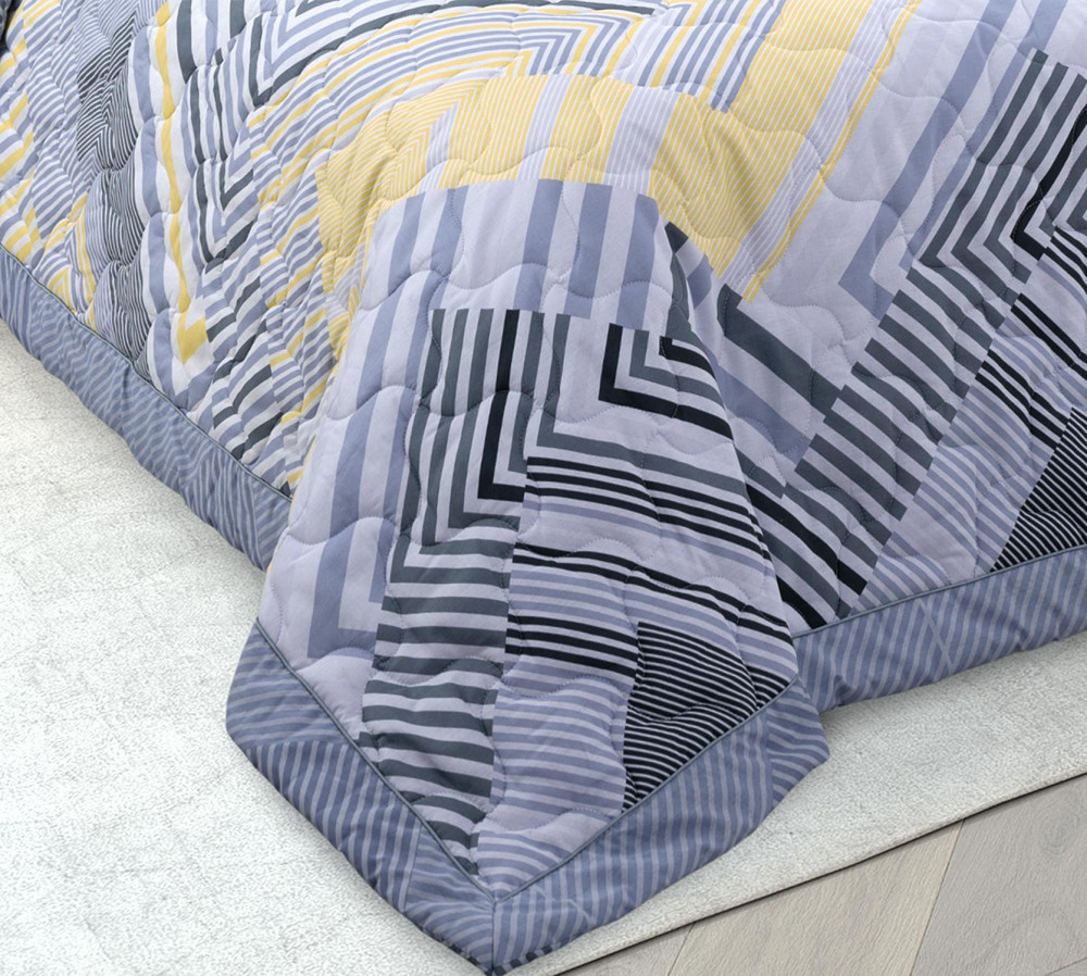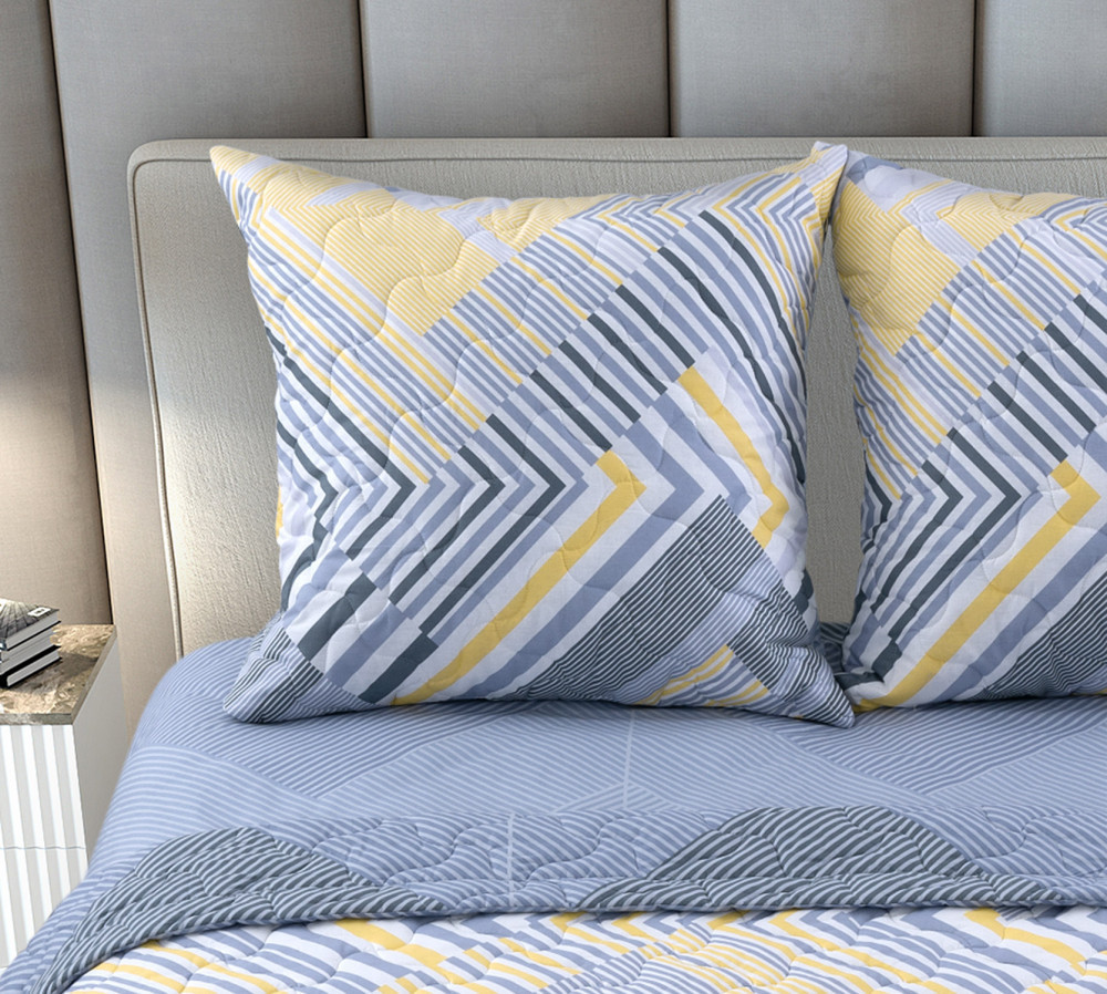 • декоративная стежка. Одеяло простёгано красивым геометрическим рисунком, по периметру украшено декоративной планкой и кантом. Наволочка двухсторонняя на молнии, верх наволочки простеган также геометрическим рисунком;