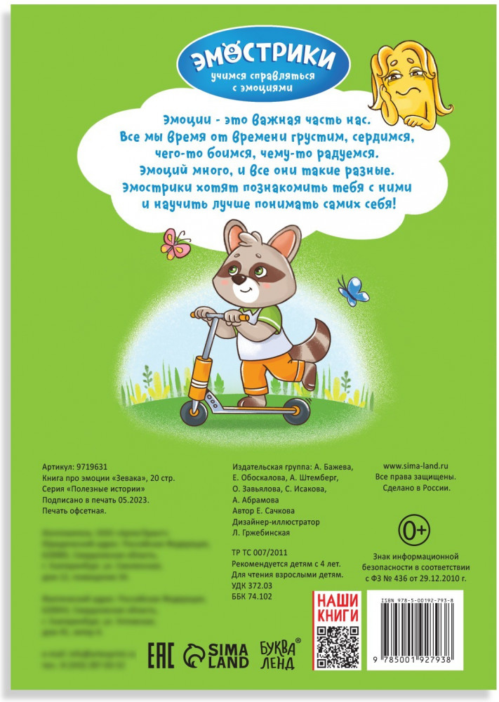 💳 Оплатить за товар можно при получении 🇰🇿 Есть бесплатная доставка по Казахстану от 1 дня 🎁 Копите бонусы с каждой покупки Серия: Полезные сказки Книга «Зевака. Что делать, если мне скучно?» поможет ребёнку научится распознавать эмоцию скуки и расскажет о методах борьбы с этой усыпляющей эмоцией. |
