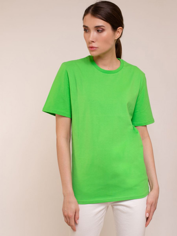 Футболка 48 размера, рост 164, на 50 размер рост 160 свободная. Очень хороший пошив, аккуратный, горловина обработана отлично. Ткань плотная, трикотажная, мало тянущаяся. Фасон прямой, со спущенным плечом. Цвет не такой яркий, как на фотографии сайта, он именно песочный.