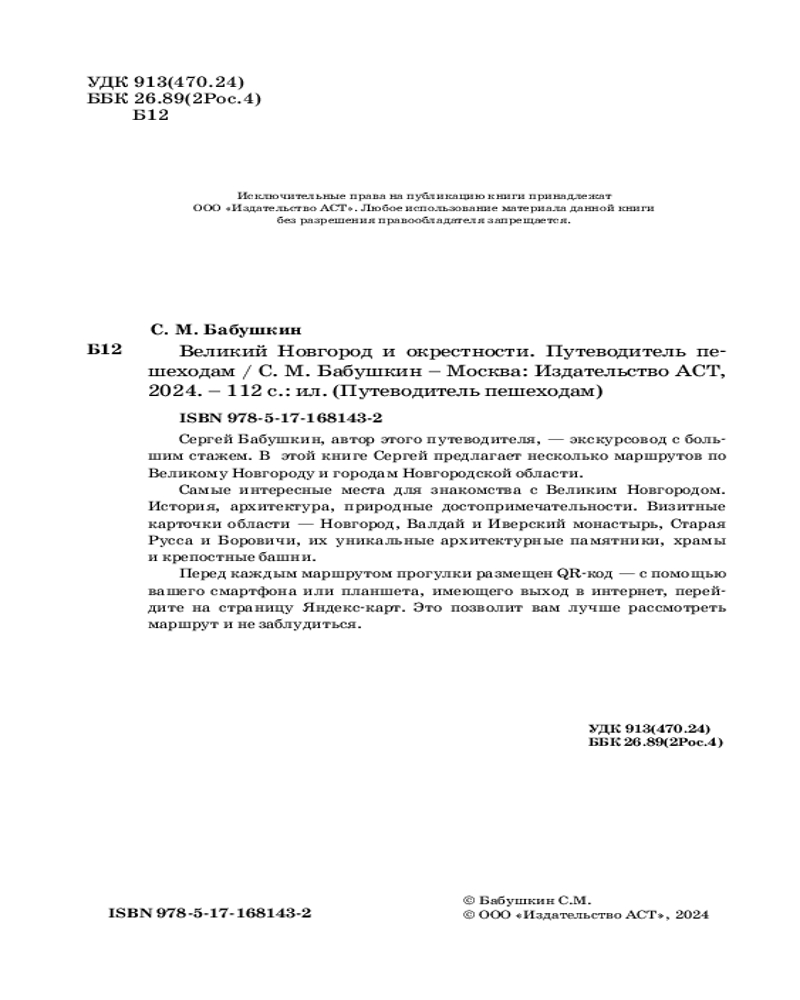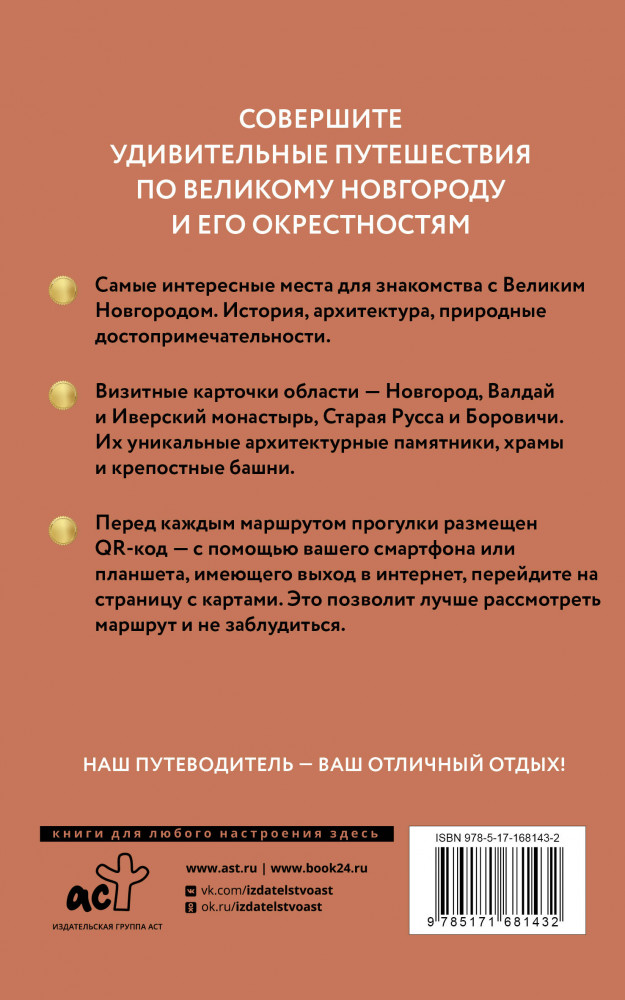 💳 Оплатить за товар можно при получении 🇰🇿 Есть бесплатная доставка по Казахстану от 1 дня 🎁 Копите бонусы с каждой покупки Серия: Путеводитель пешеходам Самые интересные места для знакомства с Великим Новгородом. История, архитектура, природные достопримечательности. Визитные карточки области — Новгород, Валдай и Иверский монастырь, Старая Русса и Боровичи, их уникальные архитектурные памятники, храмы и крепостные башни. Перед каждым маршрутом прогулки размещен QR-код — с помощью вашего смартфона или планшета, имеющего выход в интернет, перейдите на страницу Яндекс-карт. Это позволит вам лучше рассмотреть маршрут и не заблудиться. |