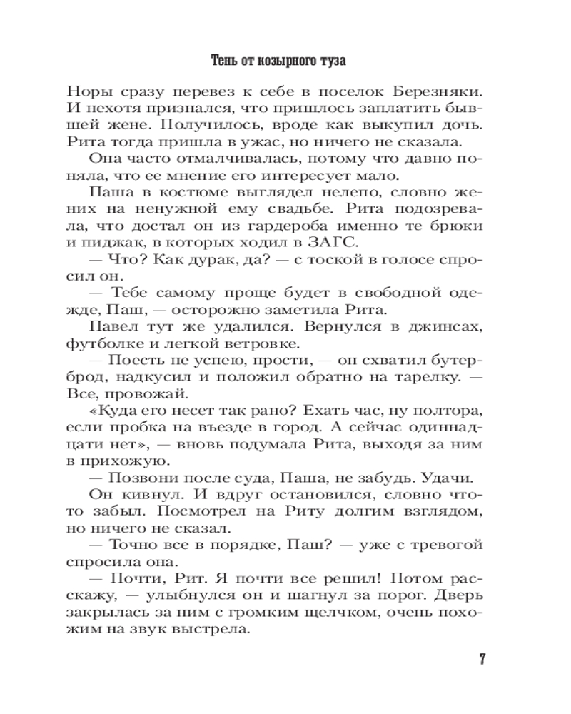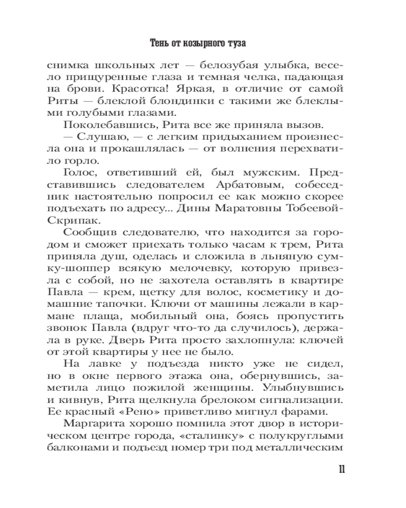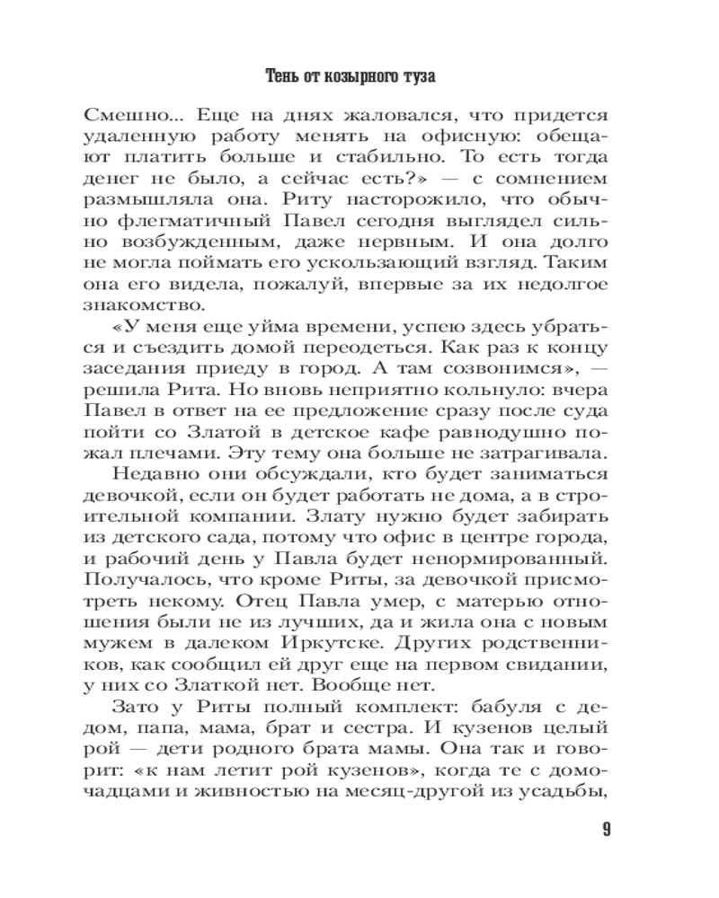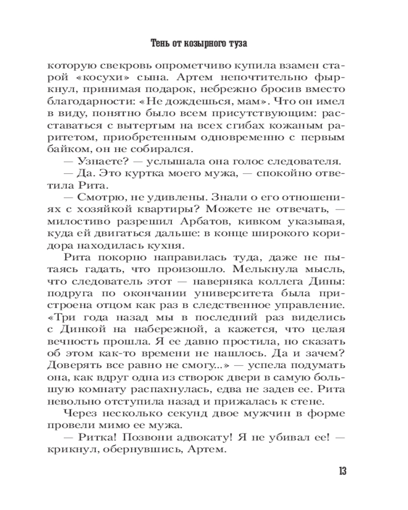 Тень от козырного тузаВ данный момент этот товар отсутствует в продаже. Возможно, у нас найдется аналогичный или похожий товар здесь. Серия: Семейный детектив Неужели для того, чтобы простить, нужно потерять? И чтобы очнуться от «спячки» в никому не нужном браке, получить привет с того света? А чтобы разобраться с новыми, вялотекущими отношениями с мужчиной, тот должен уйти из жизни? Два убийства за один день — бывшей подруги-предательницы и так и не ставшего близким друга. Прощальный подарок подруги, старые письма, странная записка, оставленная преступником на видном месте, возможно, все это поможет раскрыть преступление? А вдруг — оба? Даже если они на первый взгляд никак не связаны между собой. |