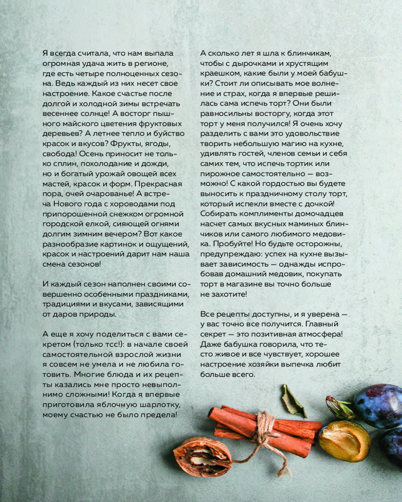 💳 Оплатить за товар можно при получении 🇰🇿 Есть бесплатная доставка по Казахстану от 1 дня 🎁 Копите бонусы с каждой покупки Серия: Кулинарное открытие Сейчас много говорят об умении наслаждаться простотой жизни, находить прекрасное в каждом моменте и каждом дне. Современные мудрецы из соцсетей наперебой рассказывают кто 10 правил, кто 20 способов найти в окружающей нас реальности приятные мелочи, которым можно порадоваться. Мы предлагаем отложить поиски прекрасного и взять ситуацию в свои руки. Четыре прекрасных сезона со своей удивительной атмосферой дают нам возможность насладиться весенней нежностью, летним ягодным настроением, хлебосольной осенью и морозными моментами счастья с ароматом корицы, ванили и пряничных специй. Для каждого сезона автор Анна Клыканова собрала рецепты домашней выпечки, которая гарантирует вам моменты удовольствия в процессе готовки и в процессе дегустации за чашкой ароматного чая в кругу тех, с кем вы счастливы делиться приятными моментами своей жизни. |