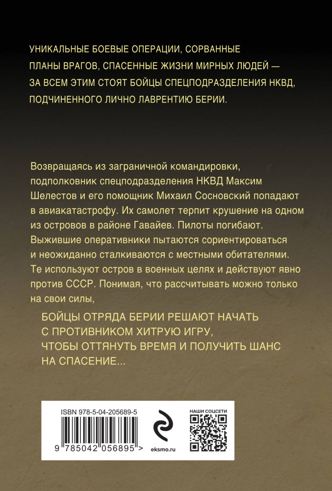 Возвращаясь из заграничной командировки, подполковник спецподразделения НКВД Максим Шелестов и его помощник Михаил Сосновский попадают в авиакатастрофу. Их самолет терпит крушение над одним из островов в районе Гавайев. Пилоты погибают. Выжившие оперативники пытаются сориентироваться и неожиданно сталкиваются с местными обитателями. Те используют остров в военных целях и действуют явно против СССР. Понимая, что рассчитывать можно только на свои силы, бойцы отряда Берии решают начать с противником хитрую «игру», чтобы оттянуть время и получить шанс на спасение... |