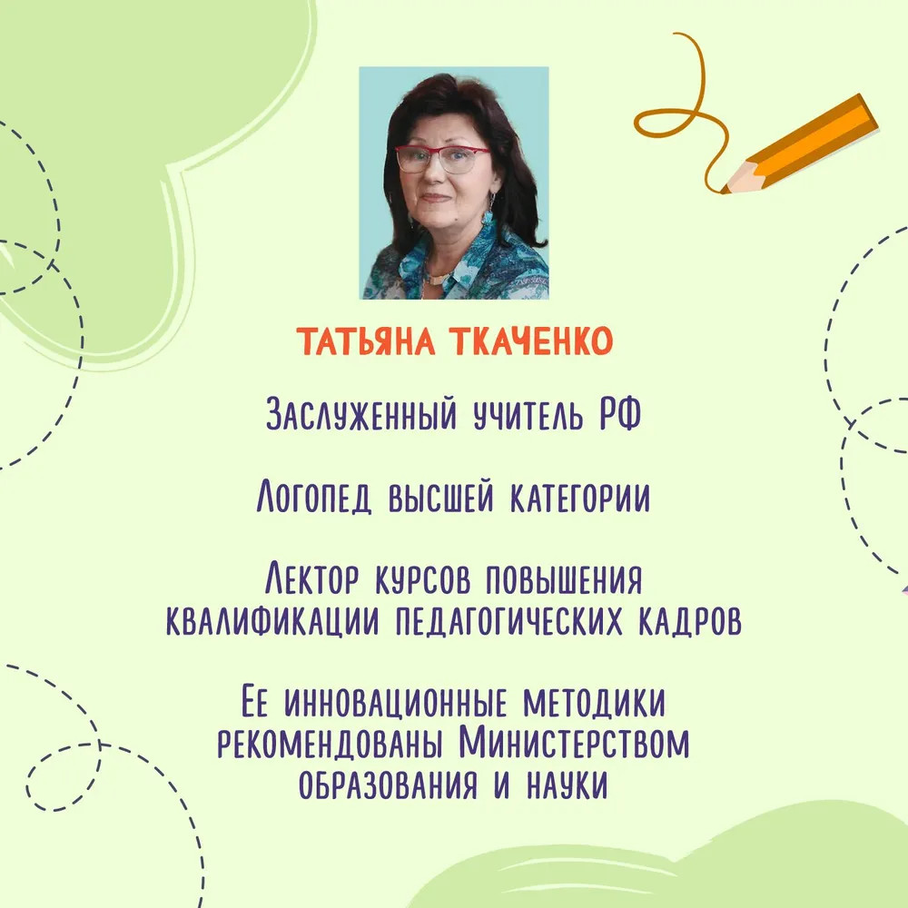 Татьяна Александровна Ткаченко — логопед высшей категории, заслуженный учитель РФ, автор 60-ти книг и учебных пособий для детей. |
