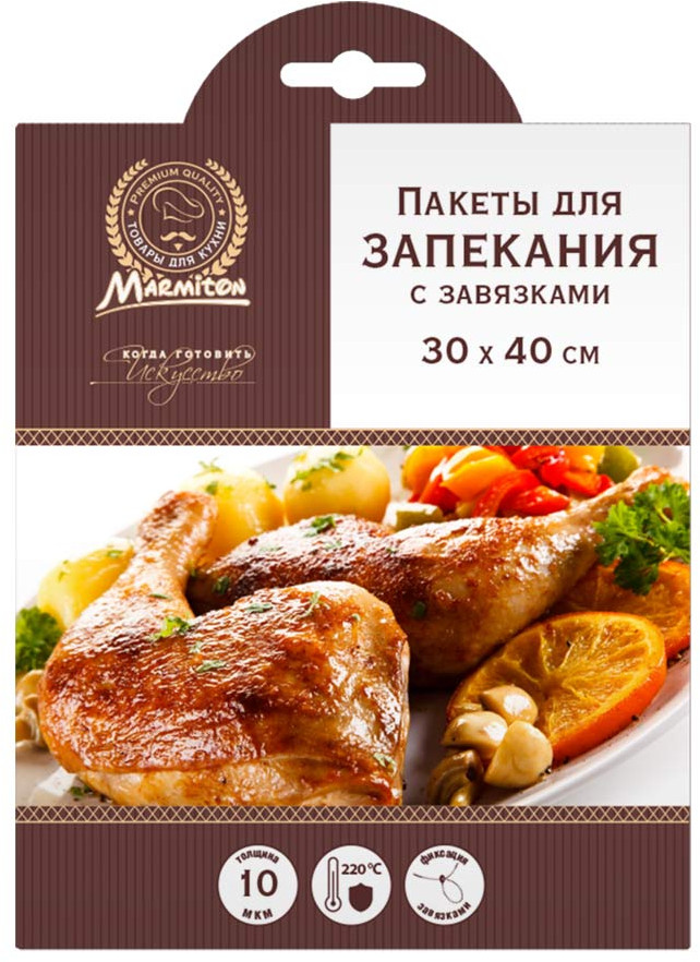 Способ применения: вложить подготовленные к запеканию продукты в пакет и закрыть его приложенными завязками. Положить заполненный и закрытый пакет в духовку и проколоть острым предметом в нескольких местах для выхода избыточного пара. Для образования поджаристой поверхности можно приоткрыть пакет незадолго до истечения времени запекания. Условия хранения: хранить в сухом, недоступном для детей месте, вдали от прямого солнечного света и нагревательных приборов. Срок годности: не ограничен при соблюдении условий хранения.