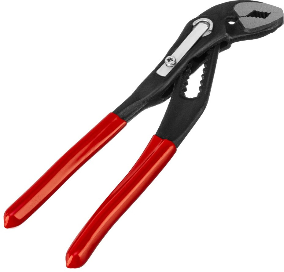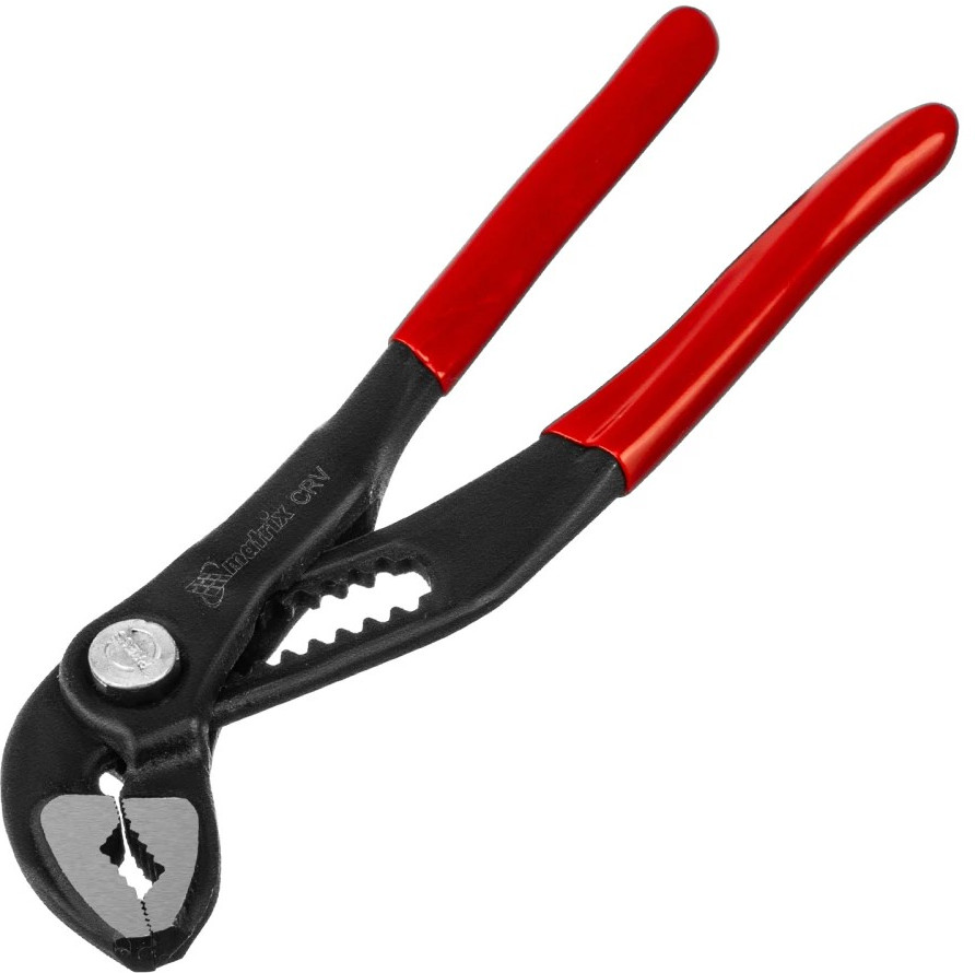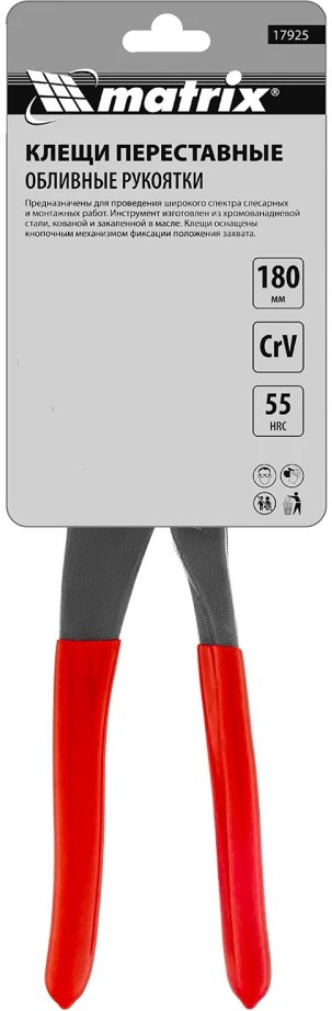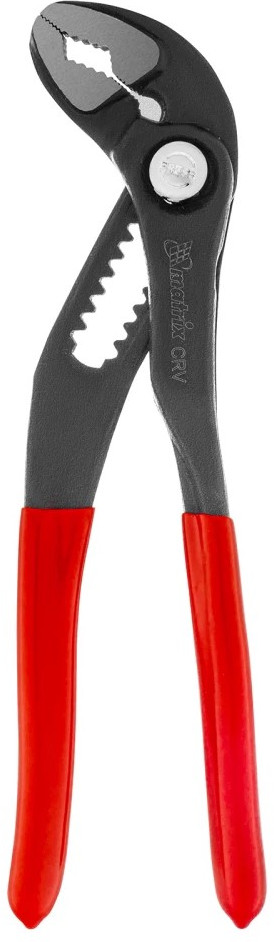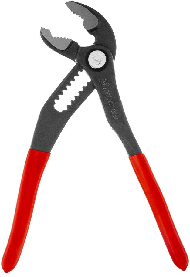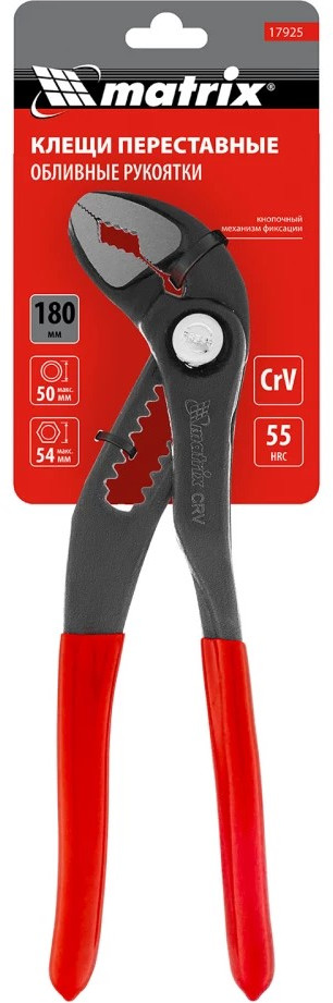 Переставные клещи Matrix выполненные из хромованадиевой стали, с кнопочным механизмом и обливными рукоятками, используются для проведения монтажных и слесарных работ. Универсальный инструмент заменяет ключи различных размеров и применяется для фиксации заготовок, откручивания гаек, зажима и удержания труб диаметром до 50 мм.