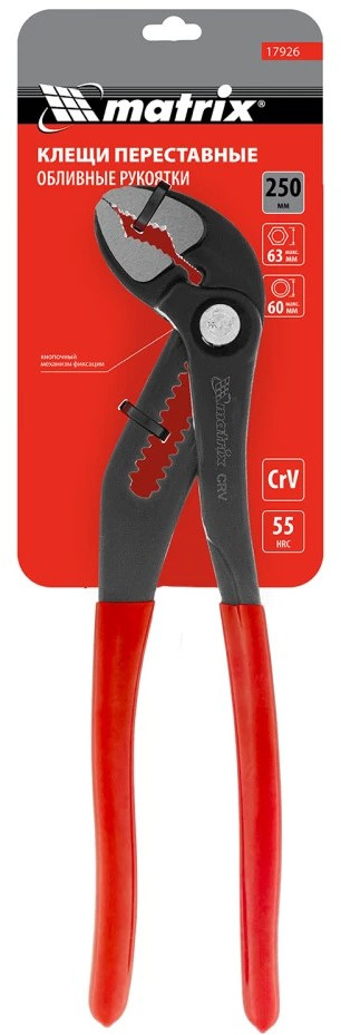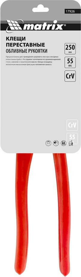 Переставные клещи Matrix выполненные из хромованадиевой стали, с кнопочным механизмом и обливными рукоятками, используются для проведения монтажных и слесарных работ. Универсальный инструмент заменяет ключи различных размеров и применяется для фиксации заготовок, откручивания гаек, зажима и удержания труб диаметром до 50 мм.