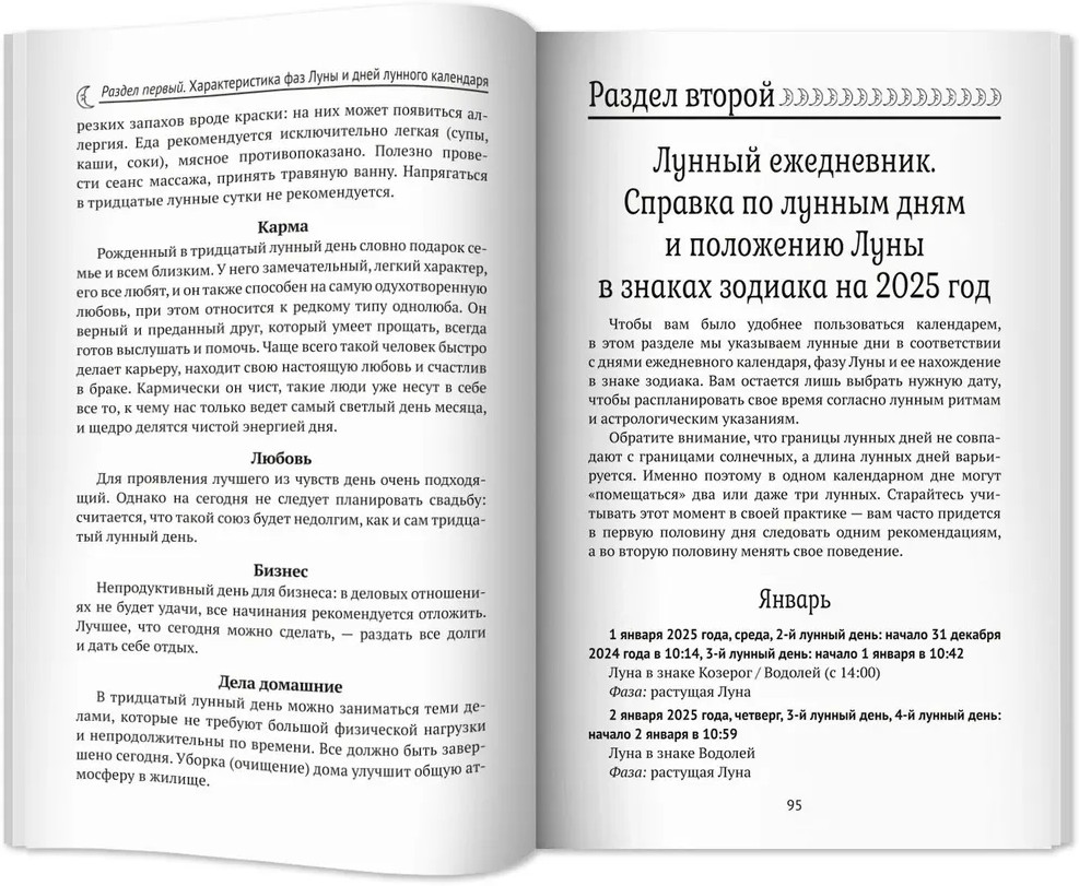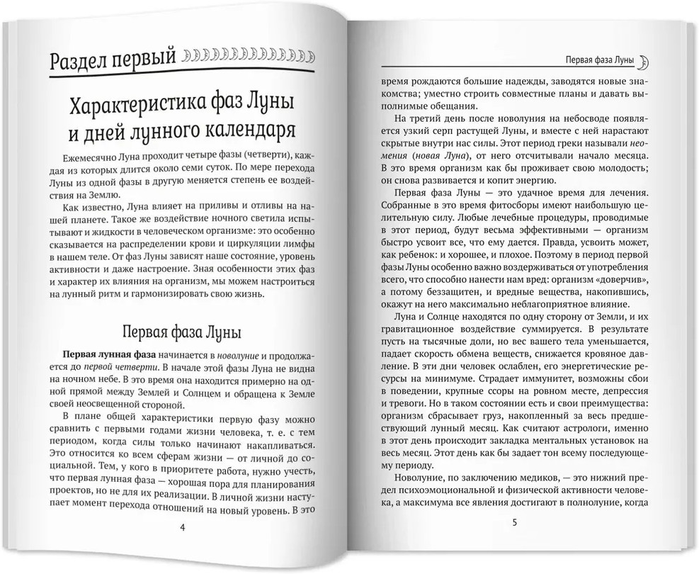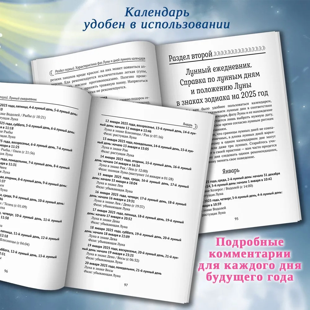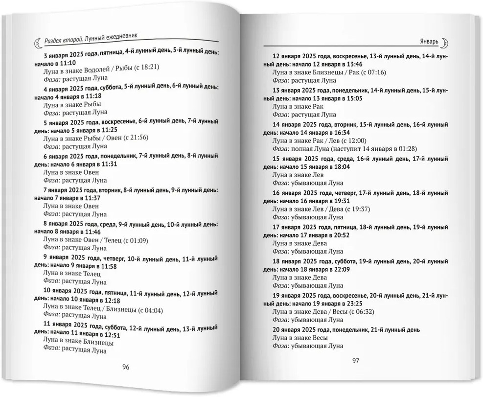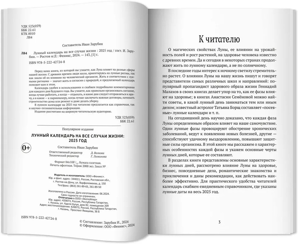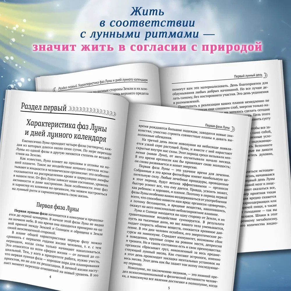 Лунный календарь на все случаи жизни 2025 годВ данный момент этот товар отсутствует в продаже. Возможно, у нас найдется аналогичный или похожий товар здесь. Перед вами книга, из которой вы узнаете, как Луна влияет на разные сферы нашей жизни. С древних времен люди жили, ориентируясь на лунные ритмы, так как знали об их влиянии на человеческий организм. Жить в соответствии с лунными ритмами — значит жить в согласии с природой, и предлагаемый календарь поможет вам в этом. Календарь удобен в использовании и снабжен подробными комментариями для каждого дня будущего года. Вы узнаете, как правильно организовать питание, когда лучше работать, а когда — отдыхать, в какие дни следует отправляться к врачу, а в какие — к парикмахеру, когда лучше заключать важные договоры, начинать строительство дома или ремонт и даже делать уборку. В лунном календаре на 2025 год читателю предлагается как справочная, так и научно-познавательная информация. Издание рассчитано на широкую читательскую аудиторию. |