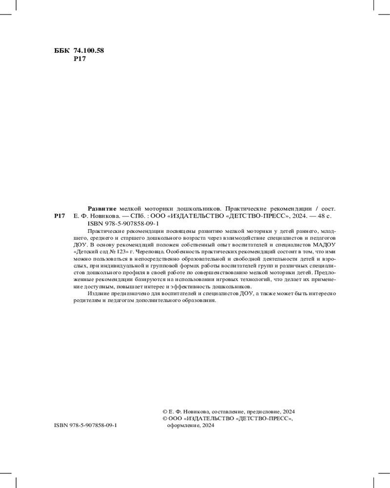 Практические рекомендации посвящены развитию мелкой моторики у детей раннего, младшего, среднего и старшего дошкольного возраста через взаимодействие специалистов и педагогов ДОУ. В основу рекомендаций положен собственный опыт воспитателей и специалистов МАДОУ «Детский сад № 123» г. Череповца. Особенность практических рекомендаций состоит в том, что ими можно пользоваться в непосредственно образовательной и свободной деятельности детей и взрослых, при индивидуальной и групповой формах работы воспитателей групп и различных специалистов дошкольного профиля в своей работе по совершенствованию мелкой моторики детей. Предложенные рекомендации базируются на использовании игровых технологий, что делает их применение доступным, повышает интерес и эффективность дошкольников. Издание предназначено для воспитателей и специалистов ДОУ, а также может быть интересно родителям и педагогам дополнительного образования. |