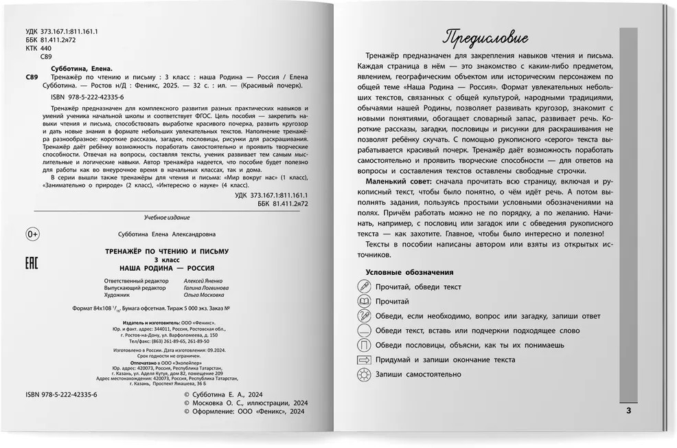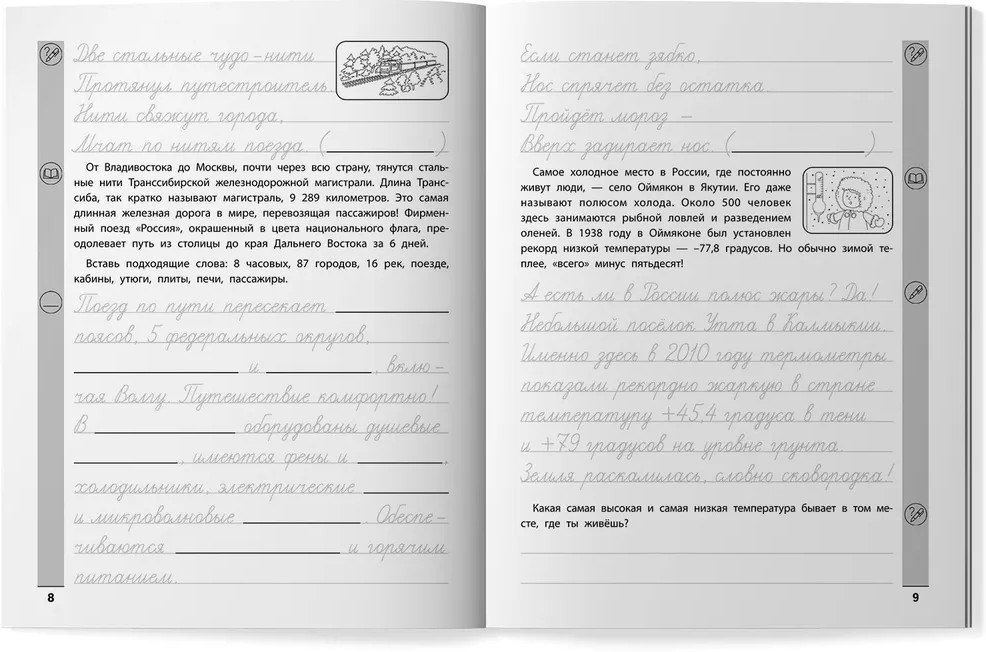 Тренажер по чтению и письму. 3 класс. Наша Родина — РоссияВ данный момент этот товар отсутствует в продаже. Возможно, у нас найдется аналогичный или похожий товар здесь. Серия: Красивый почерк Тренажёр предназначен для комплексного развития разных практических навыков и умений ученика начальной школы и соответствует ФГОС. Цель пособия — закрепить навыки чтения и письма, способствовать выработке красивого почерка, развить кругозор и дать новые знания в формате небольших увлекательных текстов. Наполнение тренажёра разнообразное: короткие рассказы, загадки, пословицы, рисунки для раскрашивания. Тренажёр даёт ребёнку возможность поработать самостоятельно и проявить творческие способности. Отвечая на вопросы, составляя тексты, ученик развивает тем самым мыслительные и логические навыки. Автор тренажёра надеется, что пособие будет полезно для работы как во внеурочное время в начальных классах, так и дома. |