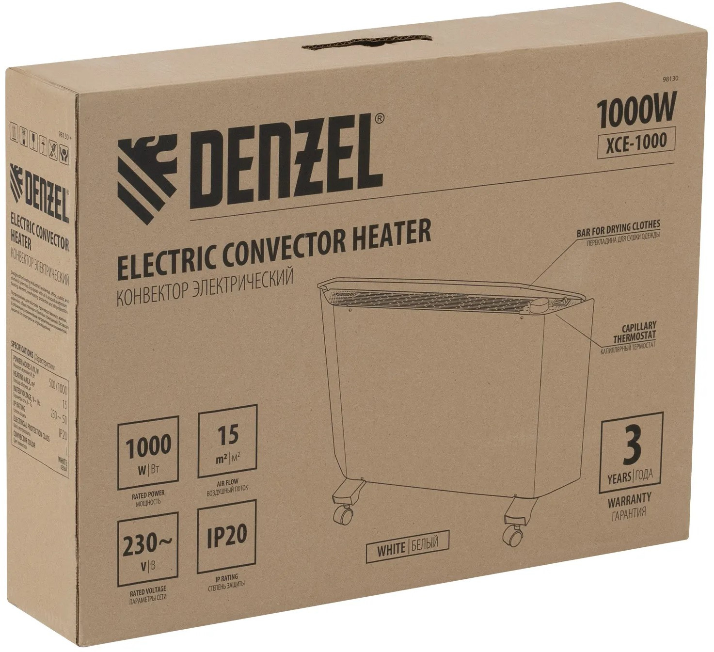 💳 Оплатить за товар можно при получении 🇰🇿 Есть бесплатная доставка по Казахстану от 1 дня 🎁 Копите бонусы с каждой покупки Электрический конвектор Denzel XCE-1000 белого цвета, максимальной мощностью 1000 Вт, с сушилкой для одежды, колесами и X-образным нагревательным элементом, работает от сети 230 В и предназначен для обогрева закрытых помещений площадью до 15 кв.м. Надежный и долговечный X-образный нагревательный элемент обеспечивает быстрый нагрев до необходимой температуры. |