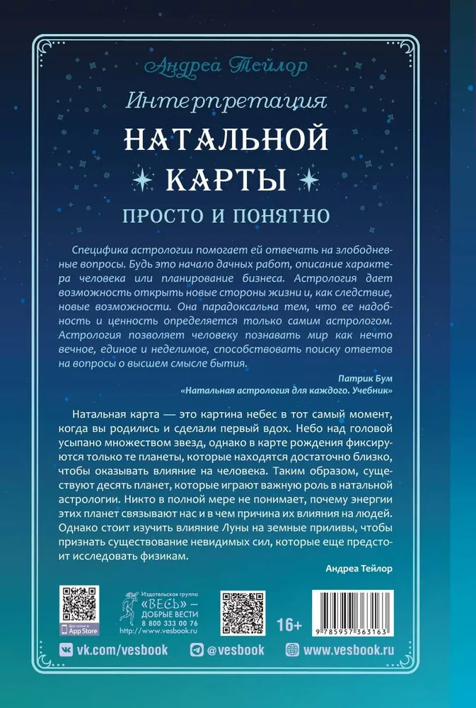 Интерпретация натальной карты просто и понятноВ данный момент этот товар отсутствует в продаже. Возможно, у нас найдется аналогичный или похожий товар здесь. Натальная карта — это картина звездного неба в тот момент, когда вы родились. Астрологи считают, что именно это положение небесных тел предопределяет то, каким потенциалом вы обладаете, какой жизненный путь вам предстоит пройти. Искусство трактовки натальной карты — ключ к постижению личности, ее сильных и слабых черт. Поэтому книга Андреа Тейлор «Интерпретация натальной карты просто и понятно» может стать для вас настоящим открытием и помощником в понимании себя и окружающих. |