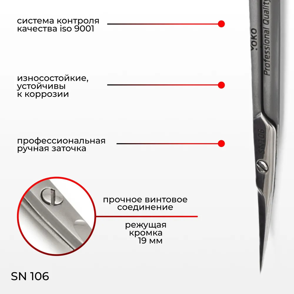 Маникюрные ножницы Yoko профессиональные инструменты , выполненные из легированной японской стали высокой прочности — 53 HRC. Обработка и заточка лезвий производиться вручную профессиональными мастерами. Особое внимание при изготовлении инструмента уделяется форме полотен, конструкции сустава и настройке хода, так как именно от этих параметров зависит безупречная работа инструмента. Все ножницы проходят обязательные процедуры со стандартами ISO 9001.