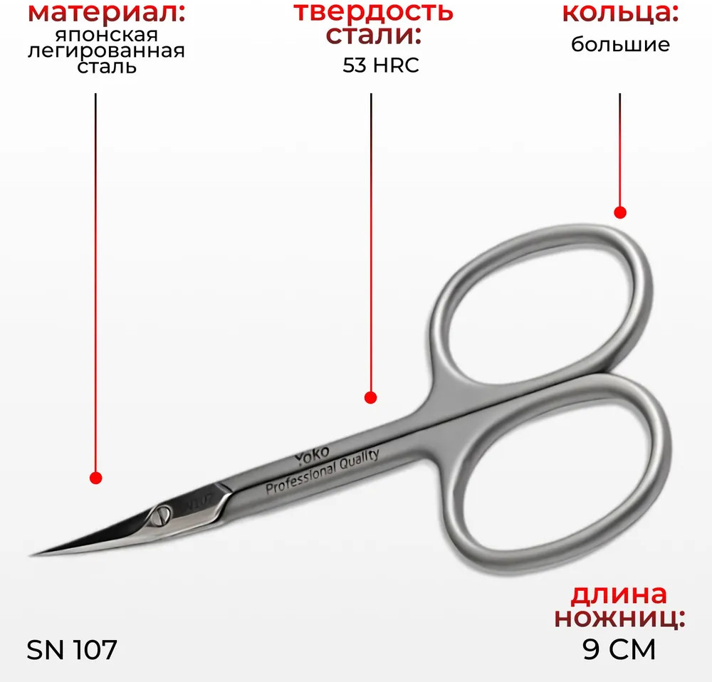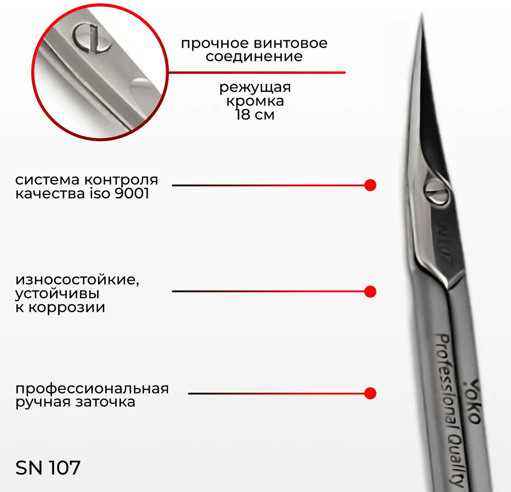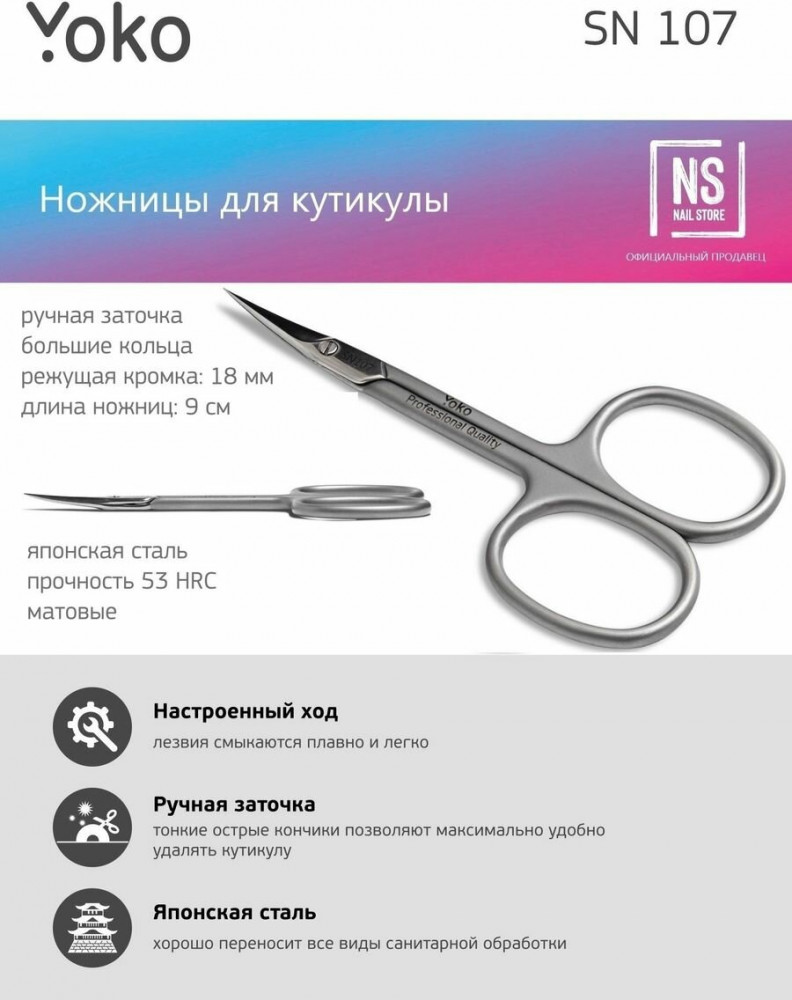 Маникюрные ножницы Yoko профессиональные инструменты, выполненные из легированной японской стали высокой прочности — 53 HRC. Обработка и заточка лезвий производится вручную профессиональными мастерами. Особое внимание при изготовлении инструмента уделяется форме полотен, конструкции сустава и настройке хода, так как именно от этих параметров зависит безупречная работа инструмента. Все ножницы проходят обязательные процедуры контроля качества в соответствии со стандартами ISO 9001.