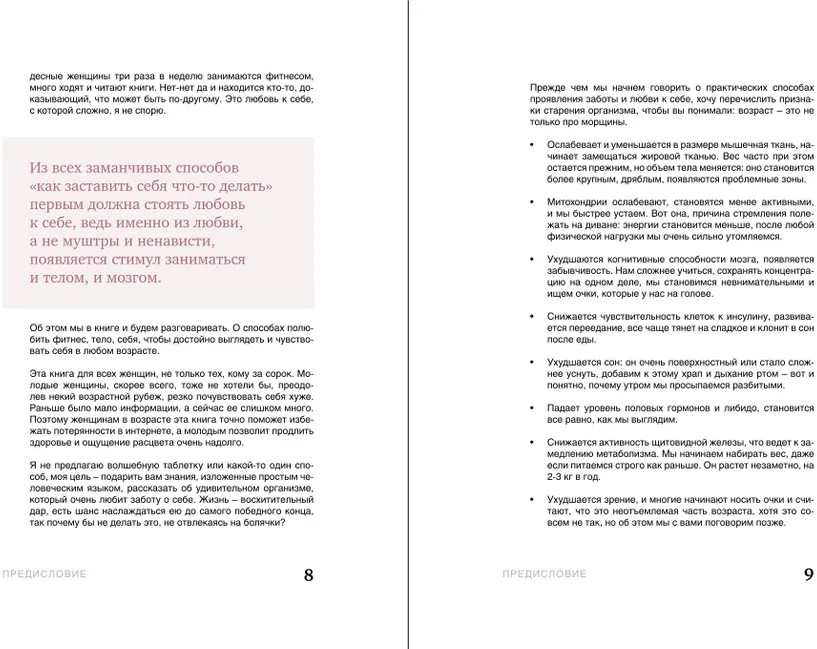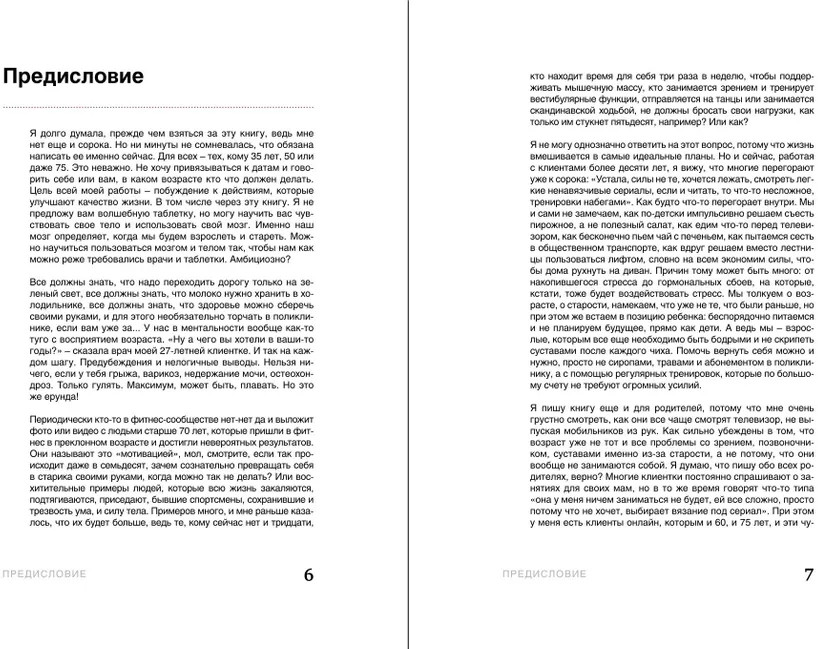 Серия: Все грани здоровья Во сколько лет у женщины заканчивается молодость и начинается зрелость и старость? В 35 лет, 50 или возможно в 70? Всё зависит от лишних килограммов? Или морщин на лице? На самом деле нет! Когда именно вы начнете стареть определяет ваш мозг и тело. Специалист по движению и сертифицированный тренер Виктория Боровская научит, что делать, чтобы вам как можно реже требовались врачи и таблетки, и вы ощущали себя не на свой возраст в паспорте, а лет на 10-20 младше. Автор не обещает «волшебную таблетку», но дает конкретный план простых ежедневных anti-age действий, выполняя которые можно отсрочить наступление старости. Прочитав книгу, вы узнаете, например, как влияет расположения языка на второй подбородок, как правильно дышать, чтобы минимизировать морщины, как двигаться, чтобы уменьшить отеки и избавиться от холки на спине, что есть, чтобы не набирать вес «с годами», какие упражнения делать и даже какую обувь носить, чтобы сохранить молодость тела. Бонус для читательниц: в книге вы найдете множество QR-кодов, по которым получите доступ к разнообразным видео с тренировками, упражнениями и тестами от тренера. |