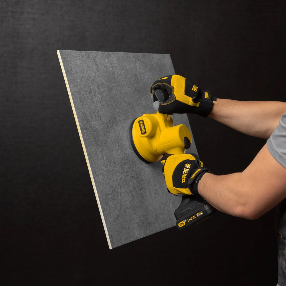 💳 Оплатить за товар можно при получении 🇰🇿 Есть бесплатная доставка по Казахстану от 1 дня 🎁 Копите бонусы с каждой покупки Машина для укладки плитки Denzel TTM-130-0 работает от аккумуляторной батареи Li-Ion емкостью 2 А/ч, с рабочим напряжением 18 В, и используется для проведения облицовочных работ. При помощи присоски диаметром 130 мм оказывает вибрационное воздействие на поверхность плитки со скоростью 500-12000 об/мин, что способствует равномерному распределению клея, а также препятствует образованию воздушных пузырьков и полостей под плиткой, позволяя избежать ее перекоса и повреждения. Машина поставляется без АКБ и зарядного устройства, на нее можно установить универсальный аккумулятор, совместимый с любым инструментом единой платформы Denzel battery system 18V серии IB. |