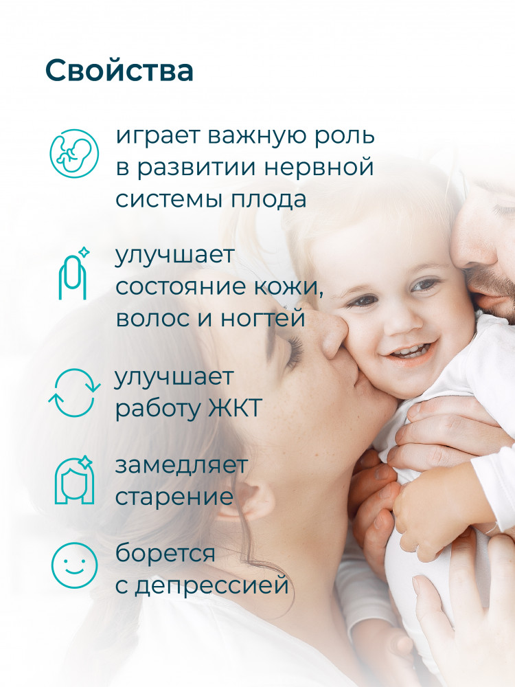 Является основой процесса метилирования, важного для синтеза ДНК и РНК, нейротрансмиттеров и детоксикации. Поддерживает психическое здоровье, снижая риск депрессии и улучшая когнитивные функции. Участвует во всех процессах, связанных с ростом клеток. Стабилизирует скачки уровня сахара в крови и повышает чувствительность клеток организма к инсулину. Нормализует процессы кроветворения. Участвует в белковом метаболизме. Понижает уровень гомоцистеина в крови, высокий уровень которого ассоциирован с повышенным риском развития сердечно-сосудистых заболеваний.Играет важную роль в поддержании иммунной системы.