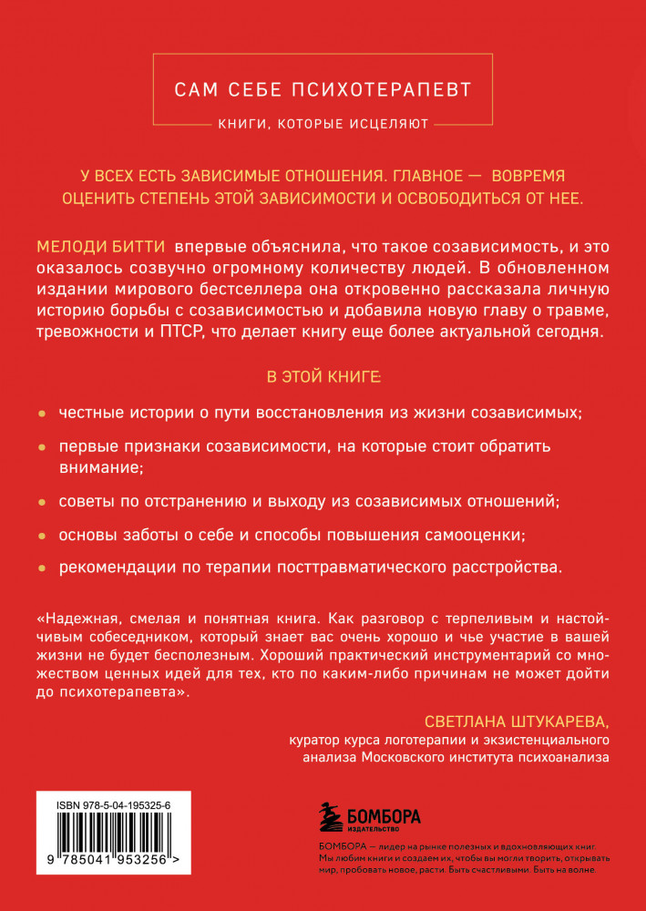 💳 Оплатить за товар можно при получении 🇰🇿 Есть бесплатная доставка по Казахстану от 1 дня 🎁 Копите бонусы с каждой покупки Серия: Сам себе психотерапевт. Книги, которые исцеляют Обновленное и дополненное издание легендарного бестселлера Мелоди Битти «Спасать или спасаться». Лучшая книга по созависимости. У всех есть зависимые отношения. Главное — вовремя оценить степень этой зависимости и освободиться от нее. |