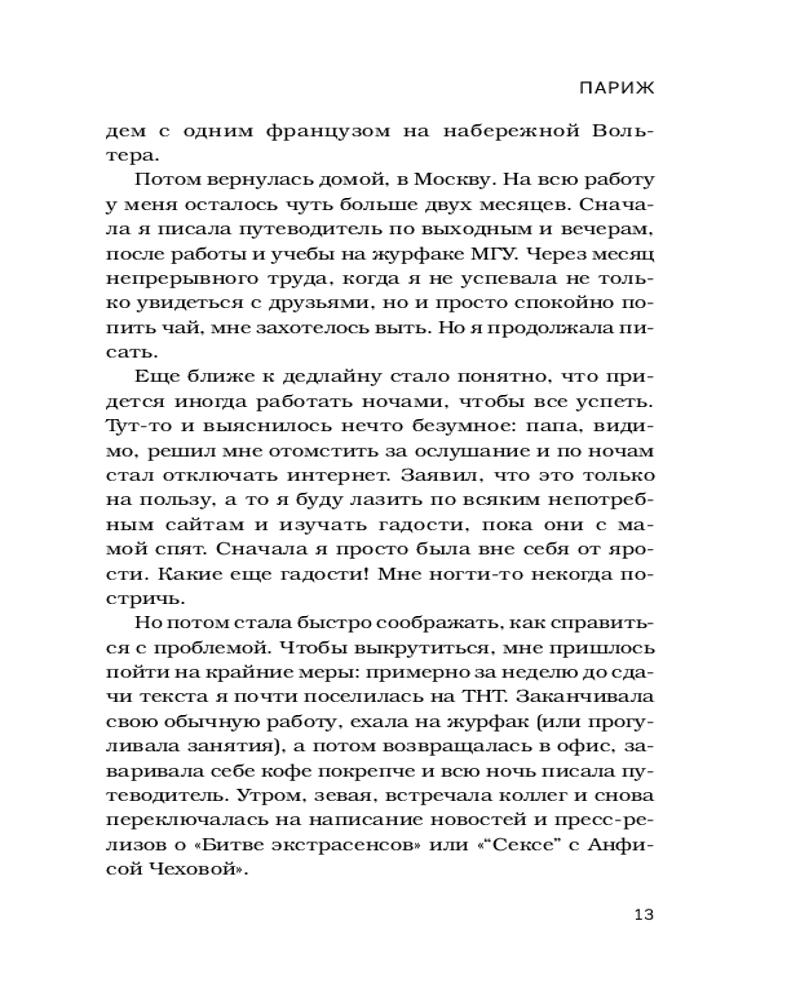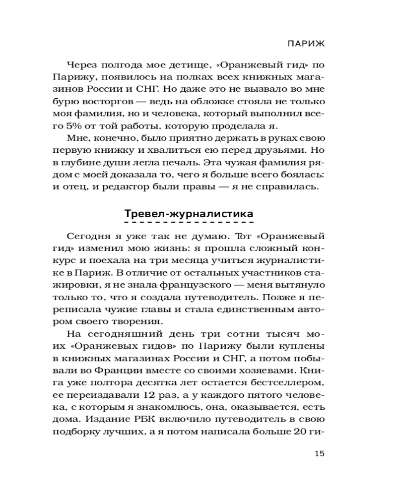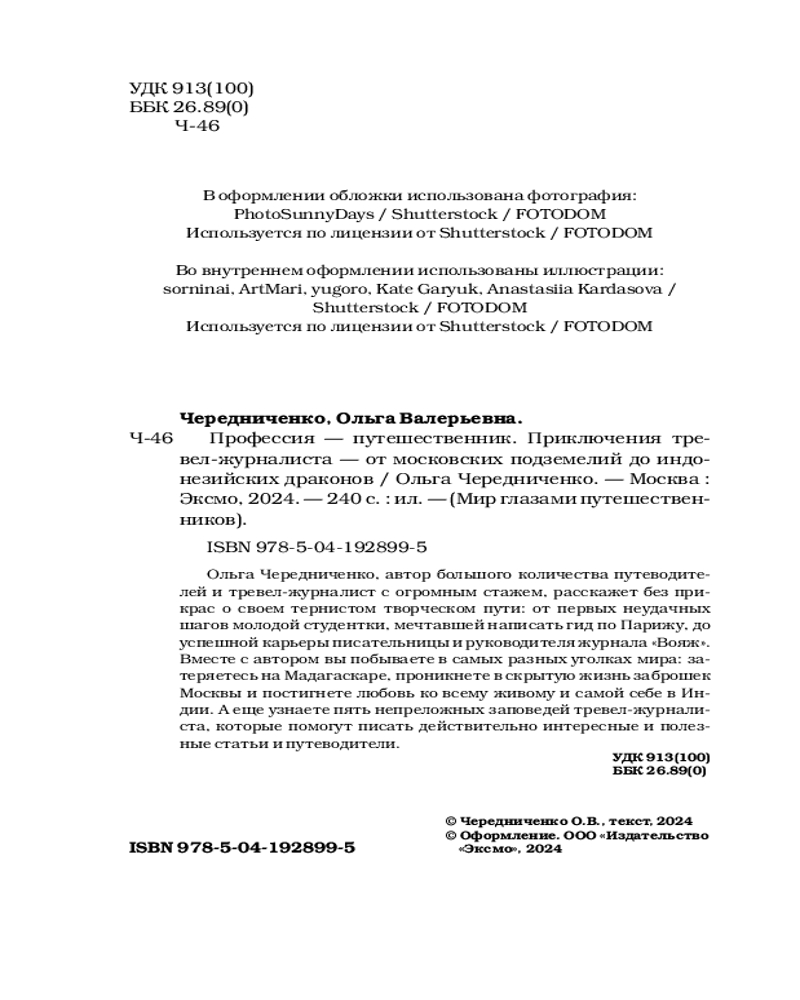 💳 Оплатить за товар можно при получении 🇰🇿 Есть бесплатная доставка по Казахстану от 1 дня 🎁 Копите бонусы с каждой покупки Серия: Мир глазами путешественников Как вы представляете себе жизнь тревел-журналиста? Бесконечные путешествия, экзотические места и друзья в разных уголках света? Конечно, всё это неотъемлемая часть работы, но еще есть утомляющие перелеты, ночевки с неизвестными людьми, трудности перевода и места, вылазки в которые могут быть опасны для жизни. Ольга Чередниченко, автор большого количества путеводителей и тревел-журналист с огромным стажем, без прикрас рассказывает о своем тернистом творческом пути: от первых неудачных шагов молодой студентки, мечтавшей написать гид по Парижу, до успешной карьеры писательницы и руководителя журнала «Вояж». Вместе с автором вы побываете в самых разных уголках мира: затеряетесь на Мадагаскаре, проникнете в скрытую жизнь заброшек Москвы и постигнете любовь ко всему живому и самой себе в Индии. А еще узнаете пять непреложных заповедей тревел-журналиста, которые помогут писать действительно интересные и полезные статьи и путеводители. |