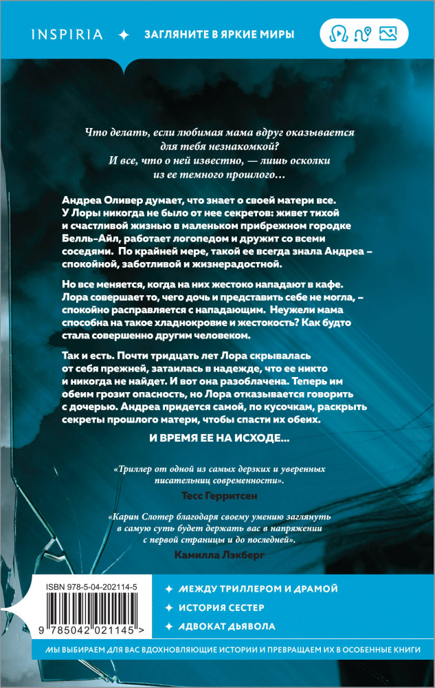 💳 Оплатить за товар можно при получении 🇰🇿 Есть бесплатная доставка по Казахстану 🎁 Копите бонусы с каждой покупки Серия: Tok. Триллеры от мастера жанра. Карин Слотер (обложка с клапанами) Что делать, если любимая мама вдруг оказывается для тебя незнакомкой? И всё, что о ней известно, — лишь осколки из ее темного прошлого... Андреа Оливер думает, что знает о своей матери всё. У Лоры никогда не было от нее секретов: живет тихой и счастливой жизнью в маленьком прибрежном городке Белль-Айл, работает логопедом и дружит со всеми соседями. По крайней мере, такой ее всегда знала Андреа — спокойной, заботливой и жизнерадостной. Но всё меняется, когда на них жестоко нападают в кафе. Лора совершает то, чего дочь и представить себе не могла, — спокойно расправляется с нападающим. |