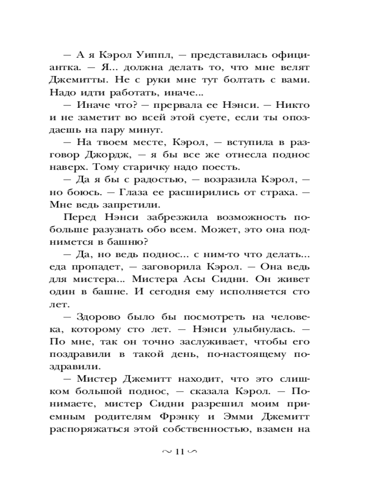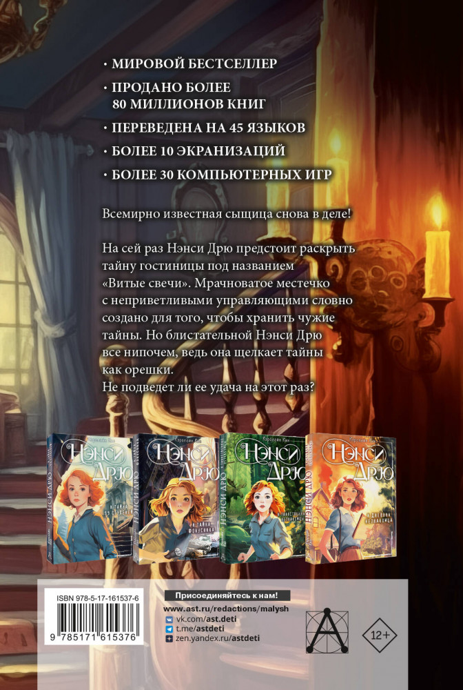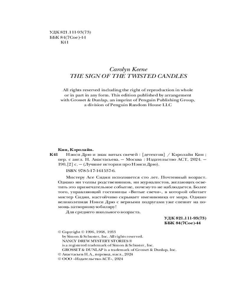 💳 Оплатить за товар можно при получении 🇰🇿 Есть бесплатная доставка по Казахстану от 1 дня 🎁 Копите бонусы с каждой покупки Серия: Лучшие истории про Нэнси Дрю Мистеру Асе Сидни исполняется сто лет. Почтенный возраст. Однако ни толпы родственников, ни журналистов, желающих осветить это примечательное событие, почему-то не наблюдается. Более того, управляющий гостиницы «Витые свечи», в которой обитает мистер Сидни, настойчиво скрывает именинника от мира. Однако великолепная Нэнси Дрю с верными подругами уже спешит на помощь затворнику-юбиляру! |