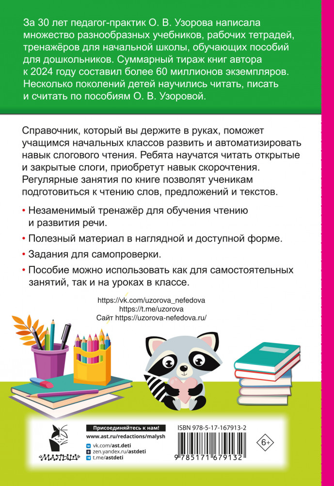 💳 Оплатить за товар можно при получении 🇰🇿 Есть бесплатная доставка по Казахстану от 1 дня 🎁 Копите бонусы с каждой покупки Серия: Справочник в цветных таблицах: просто и понятно «Слоговые таблицы. Лёгкий способ научиться читать» — это пособие для учеников начальных классов, разработанное известным педагогом-практиком О. В. Узоровой. Благодаря занятиям по книге школьник научится читать слоги из одной, двух и трёх букв, разовьёт речевые навыки, увеличит скорость чтения. Пособие содержит слоговые таблицы и задания на время, которые помогут оценить успехи ребёнка. Для начального образования. |