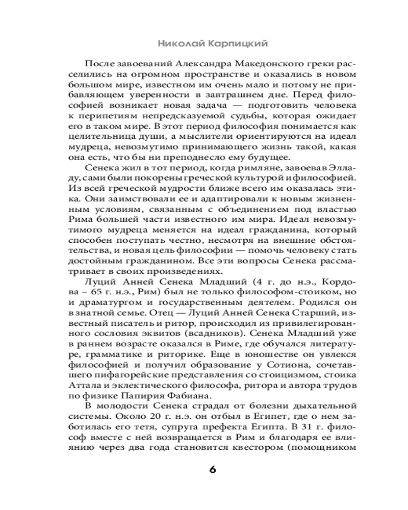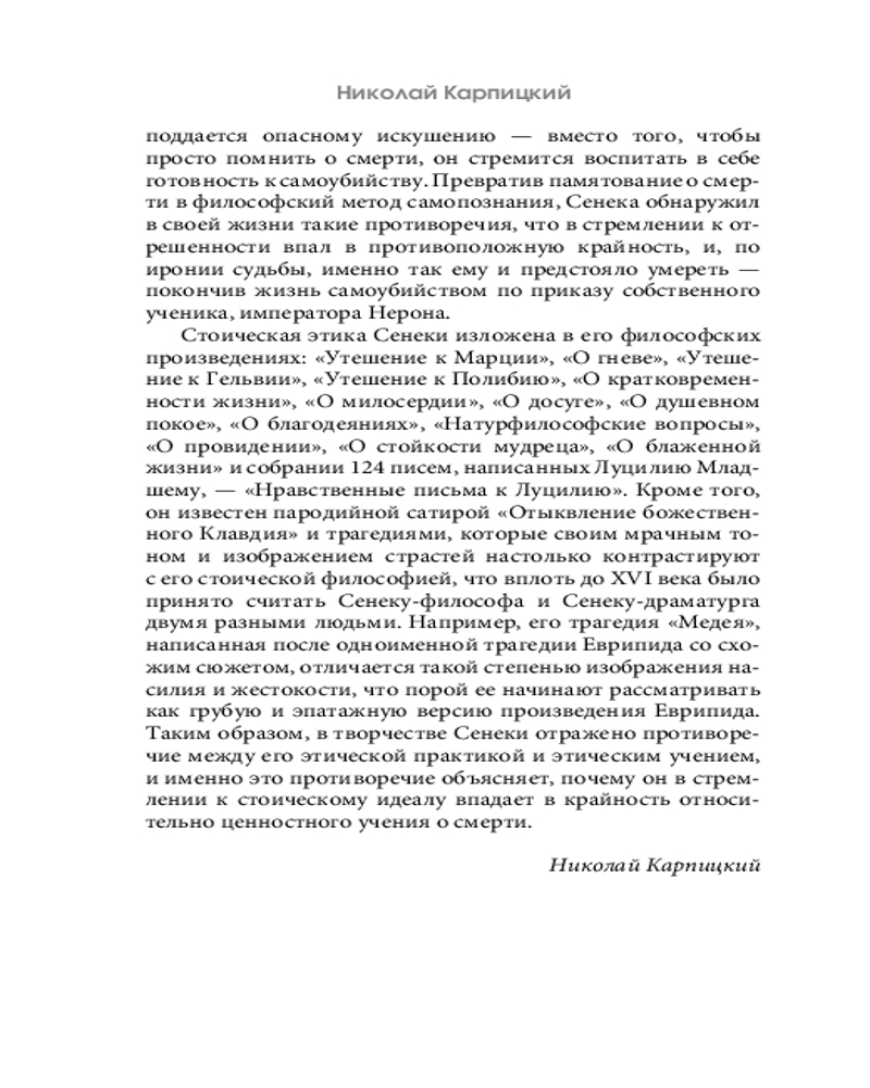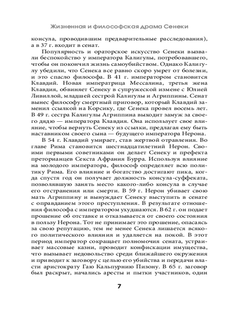 | Родился примерно в 4 году до н. э. в Кордове (Испания) в семье преподавателя риторики Сенеки-старшего. В юности попал в Рим, где учился ораторскому искусству и философии. Проблемы со здоровьем вынудили Сенеку покинуть Рим и уехать в Египет. Около 31 года нашей эры он возвратился в Италию, окунулся в политику — и очень быстро стал заклятым врагом императора Калигулы (легенда гласит, что Калигула не казнил Сенеку лишь потому, что был уверен — тот и сам вскоре умрет). В 41 году... |