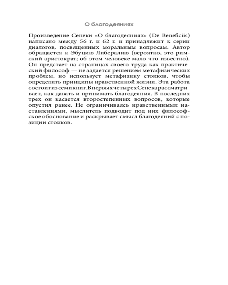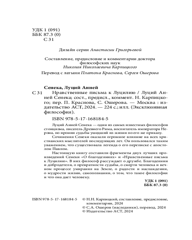 💳 Оплатить за товар можно при получении 🇰🇿 Есть бесплатная доставка по Казахстану 🎁 Копите бонусы с каждой покупки Серия: Эксклюзивная философия Луций Анней Сенека — один из самых известных философов стоицизма, писатель Древнего Рима, воспитатель императора Нерона, по иронии судьбы позже ушедший из жизни по его же приказу. Сочинения Сенеки оказали огромное влияние на всех христианских мыслителей последующих веков. Он пользовался таким уважением, что даже существовала легенда о его переписке с апостолом Павлом. Настоящую хрестоматию составили фрагменты двух лучших произведений Сенеки «О благодеяниях» и «Нравственные письма к Луцилию». В них философ рассуждает о дружбе, благодеянии и добродетели, о превратностях судьбы, о смерти человека и его вечном процессе умирания на Земле, о радости и наслаждении, о мудрости жизни, о самопознании, о том, что такое философия и что она дает человеку. |