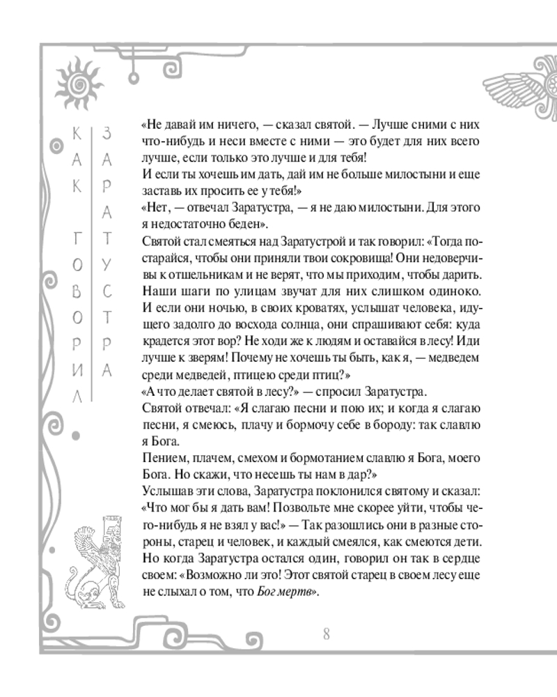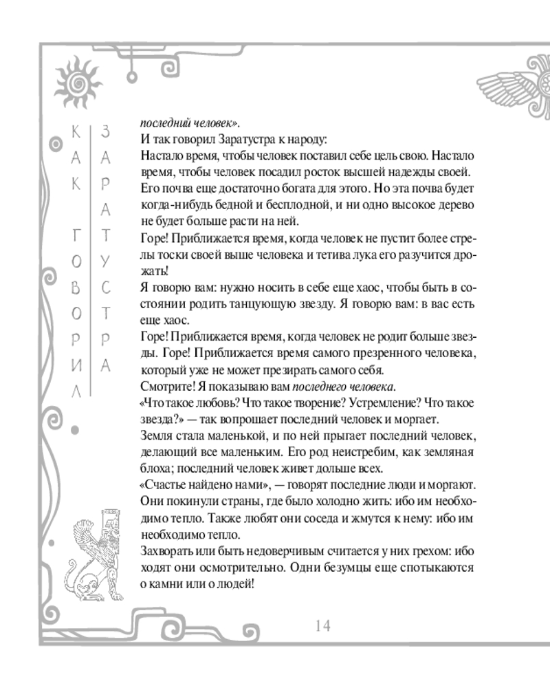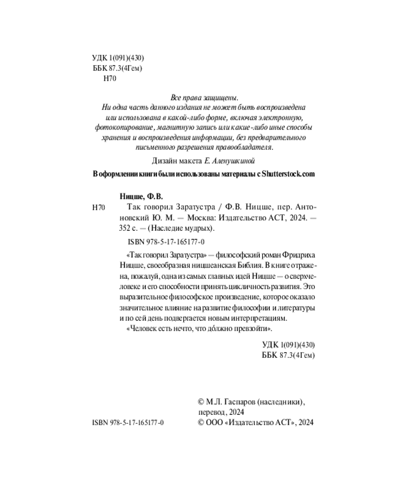 💳 Оплатить за товар можно при получении 🇰🇿 Есть бесплатная доставка по Казахстану от 1 дня 🎁 Копите бонусы с каждой покупки Серия: Наследие мудрых «Так говорил Заратустра» — философский роман Фридриха Ницше, своеобразная ницшеанская Библия. В книге отражена, пожалуй, одна из самых главных идей Ницше — о сверхчеловеке и его способности принять цикличность развития. Это выразительное философское произведение, которое оказало значительное влияние на развитие философии и литературы и по сей день подвергается новым интерпретациям. «Человек есть нечто, что дόлжно превзойти». |