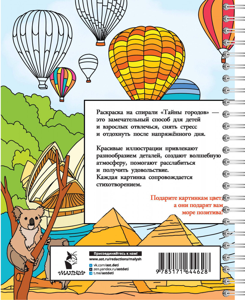 💳 Оплатить за товар можно при получении 🇰🇿 Есть бесплатная доставка по Казахстану от 1 дня 🎁 Копите бонусы с каждой покупки Серия: Раскраска на спирали Раскраска на спирали «Тайны городов» — это замечательный способ для детей и взрослых отвлечься, снять стресс и отдохнуть после напряженного дня. Красивые иллюстрации привлекают разнообразием деталей, создают волшебную атмосферу, помогают расслабиться и получить удовольствие. Каждая картинка сопровождается стихотворением. |