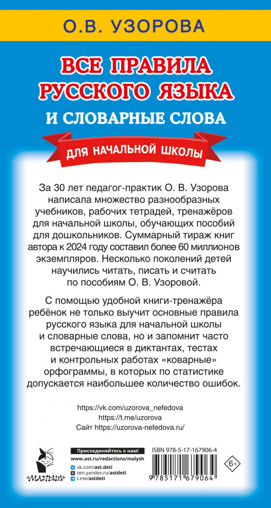 💳 Оплатить за товар можно при получении 🇰🇿 Есть бесплатная доставка по Казахстану от 1 дня 🎁 Копите бонусы с каждой покупки Серия: Самый быстрый способ: Узорова «Все правила русского языка и словарные слова. Для начальной школы» — книга известного педагога-практика О. В. Узоровой, автора самых издаваемых в России учебников и обучающих пособий. В книге приведены все основные правила русского языка курса начальной школы, а также часто встречающиеся в диктантах, тестах и контрольных работах словарные слова. Для начального образования. |