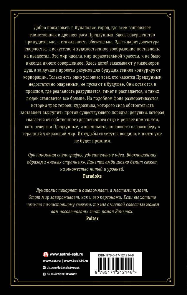 💳 Оплатить за товар можно при получении 🇰🇿 Есть бесплатная доставка по Казахстану от 1 дня 🎁 Копите бонусы с каждой покупки Серия: Иная фантастика Добро пожаловать в Лунаполис, город, где всем заправляет таинственная и древняя раса Предлунных. Здесь совершенство принудительно, а гениальность обязательна. Здесь царит диктатура творчества, а искусство и художественное воображение поставлены на пьедестал. Это мир идеала, мир поразительной красоты, и не было никогда ничего совершеннее. Здесь детей заказывают у инженеров душ, а за лучшие проекты разумов для будущих гениев конкурируют корпорации. Только есть одно условие: всех, кто кажется Предлунным недостаточно одаренным, не пускают в будущее. Они остаются в прошлом, где реальность разрушается, гниет и распадается, и таких людей становится всё больше. На подобном фоне разворачиваются истории трех героев: художника, которого сила обстоятельств заставляет выступить против существующего порядка; девушки, которая спасается от собственного деспотичного отца и решает помочь тем, кого отвергли Предлунные; и космонавта, попавшего на свою беду в странный умирающий мир. Их судьбы сплетутся воедино, и ничто уже не будет прежним. |